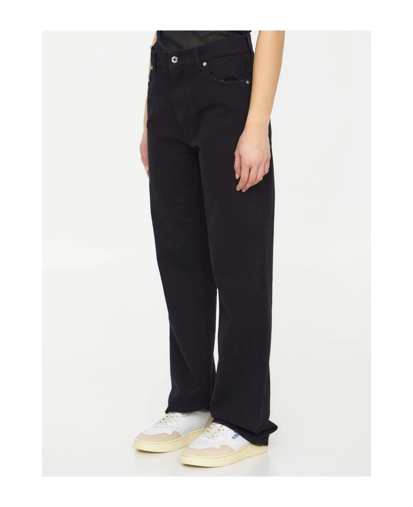 High-waisted flared jeans in black denim. It features zip and button closure, five-pocket design “Kim Dolce & Gabbana” metallic plate at the back, “Kim Dolce & Gabbana” label on front coin pocket and belt loops.