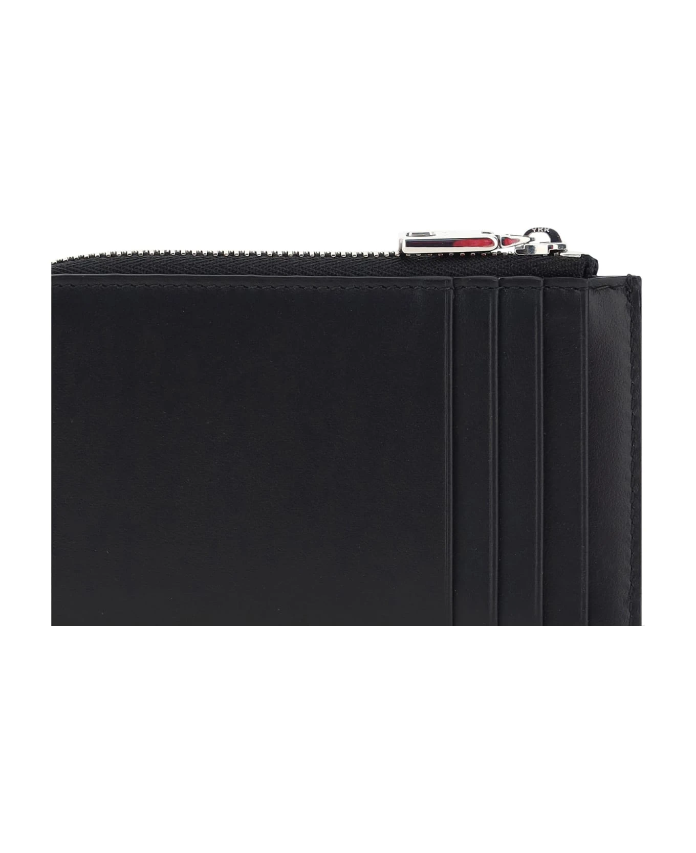 Calfskin card case by dolce&gabbana, coin compartment with top zipper closure, card slot on back, iconic d&g brand monogram embossed on front.