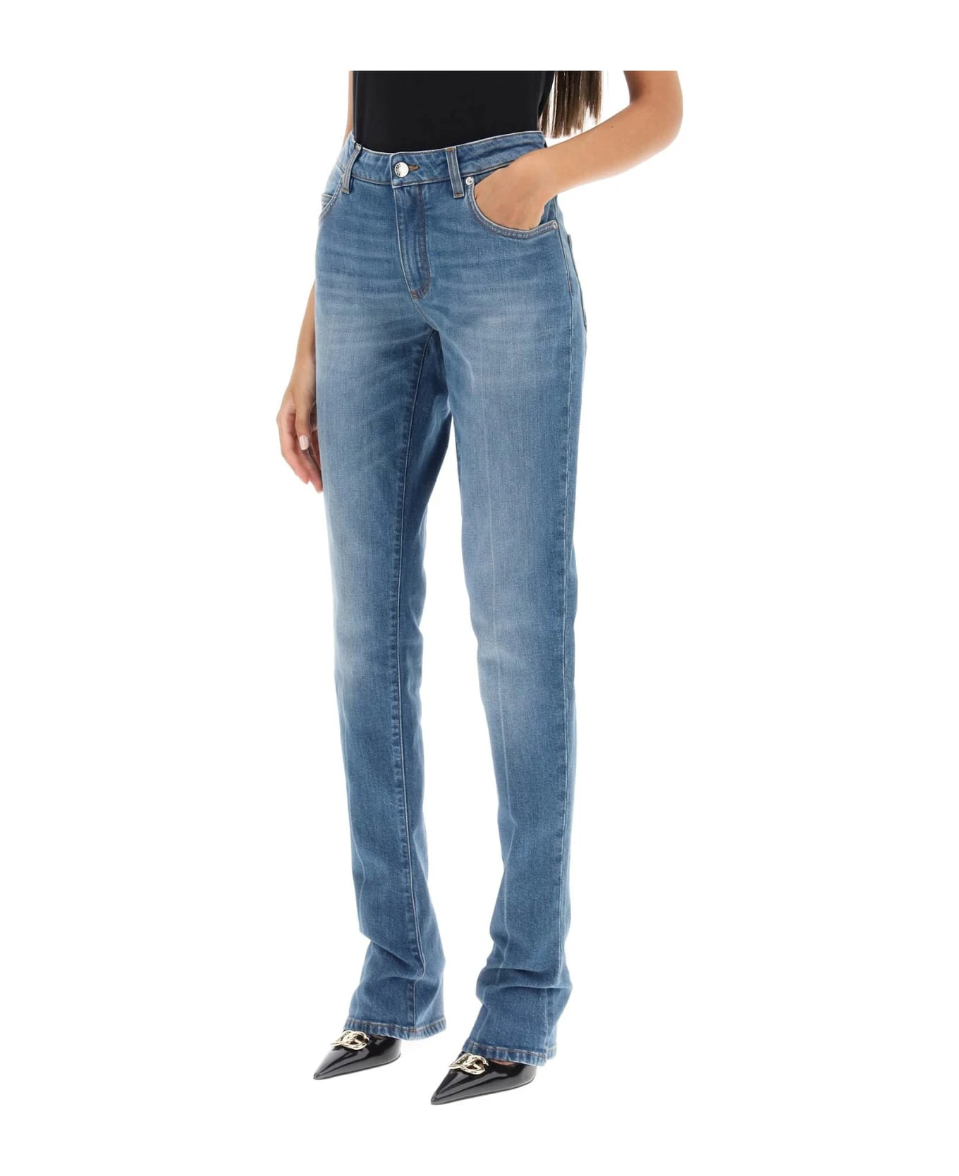 Dolce & Gabbana low-rise jeans cut to a slim fit with trumpet hem. Made from stretch denim with a classic five pocket design, this piece is finished with contrast stitching, metal logo plaque at the back, belt loops, and a zip fly with button fastening. The model is 177 cm tall and wears a size IT 40.