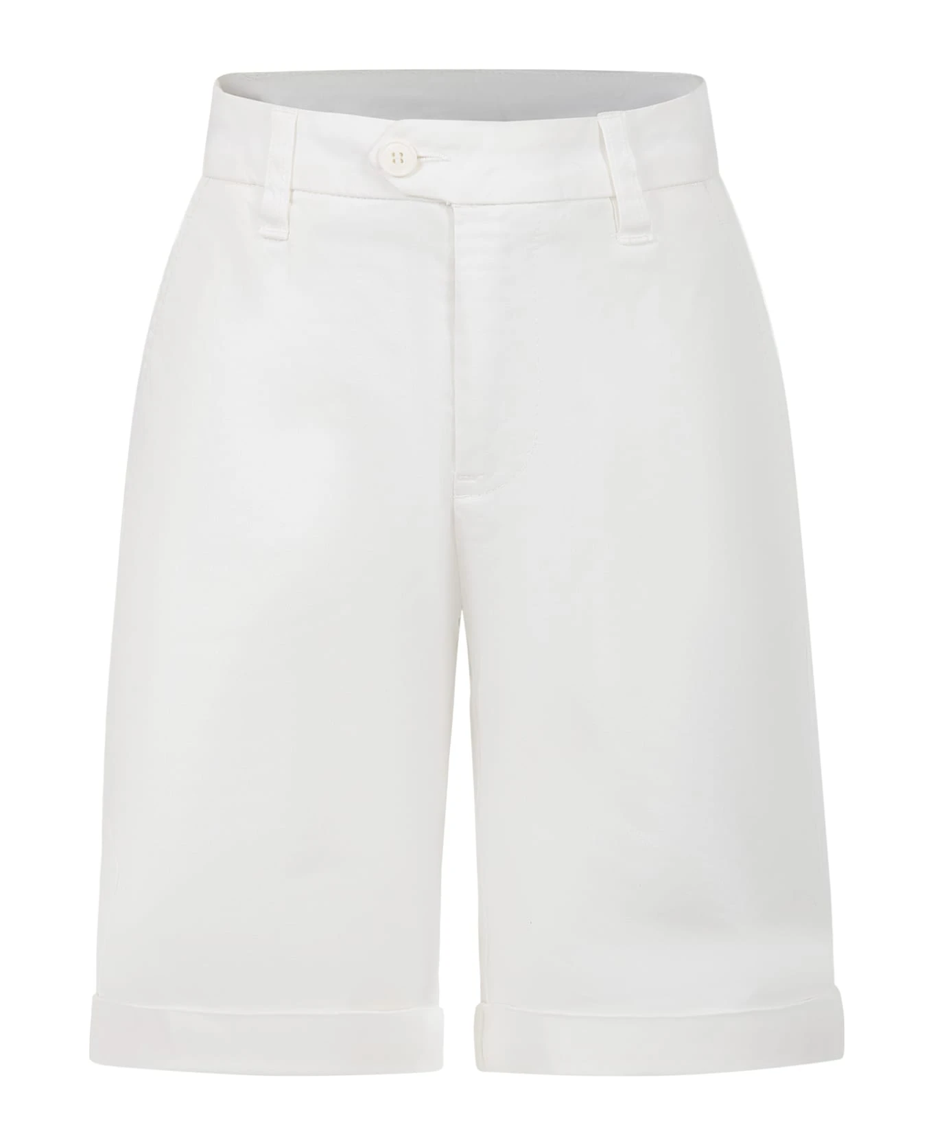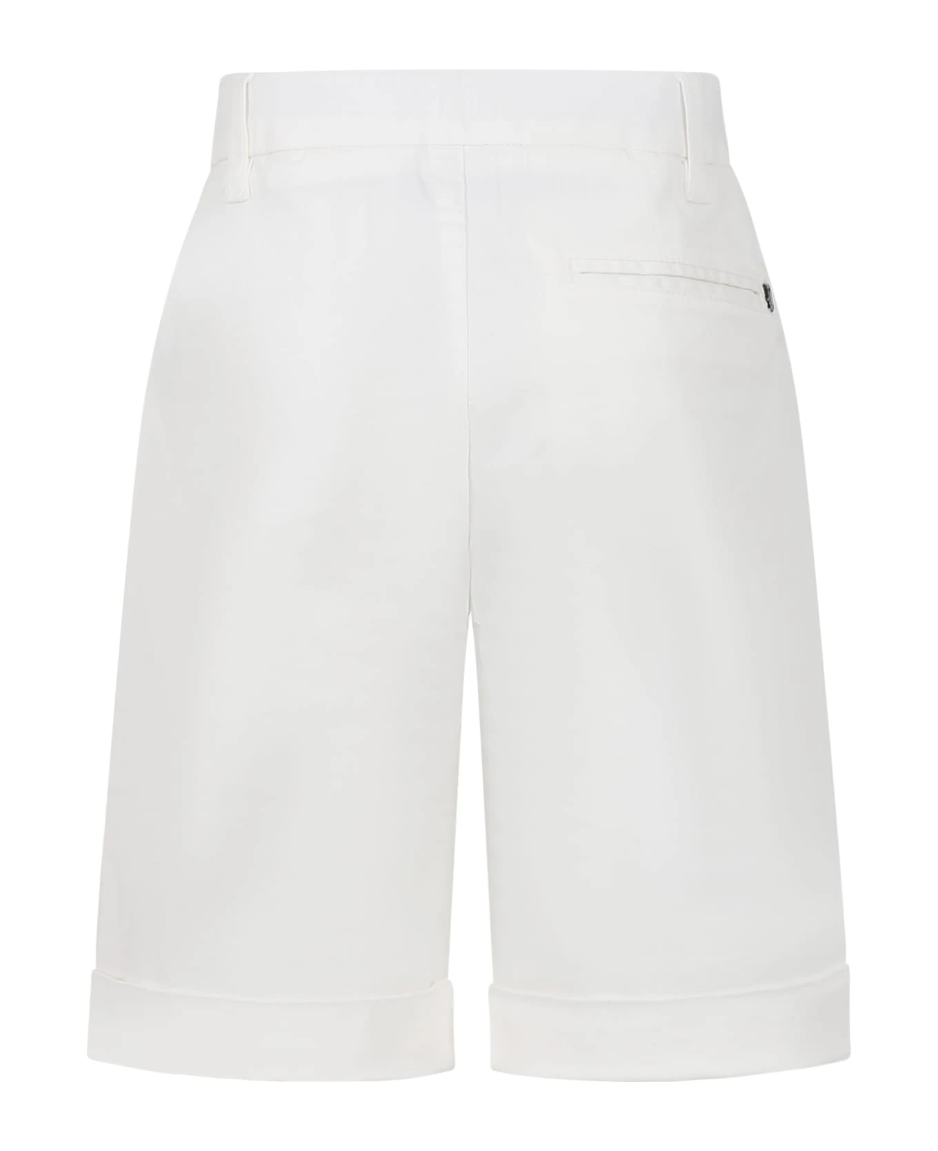 White shorts in cotton blend, with belt loops, front closure with zip and button, adjustable waist thanks to internal elastic bands with button, side and back pockets, bottom leg with turn-ups. They are embellished with logo patch on the back.