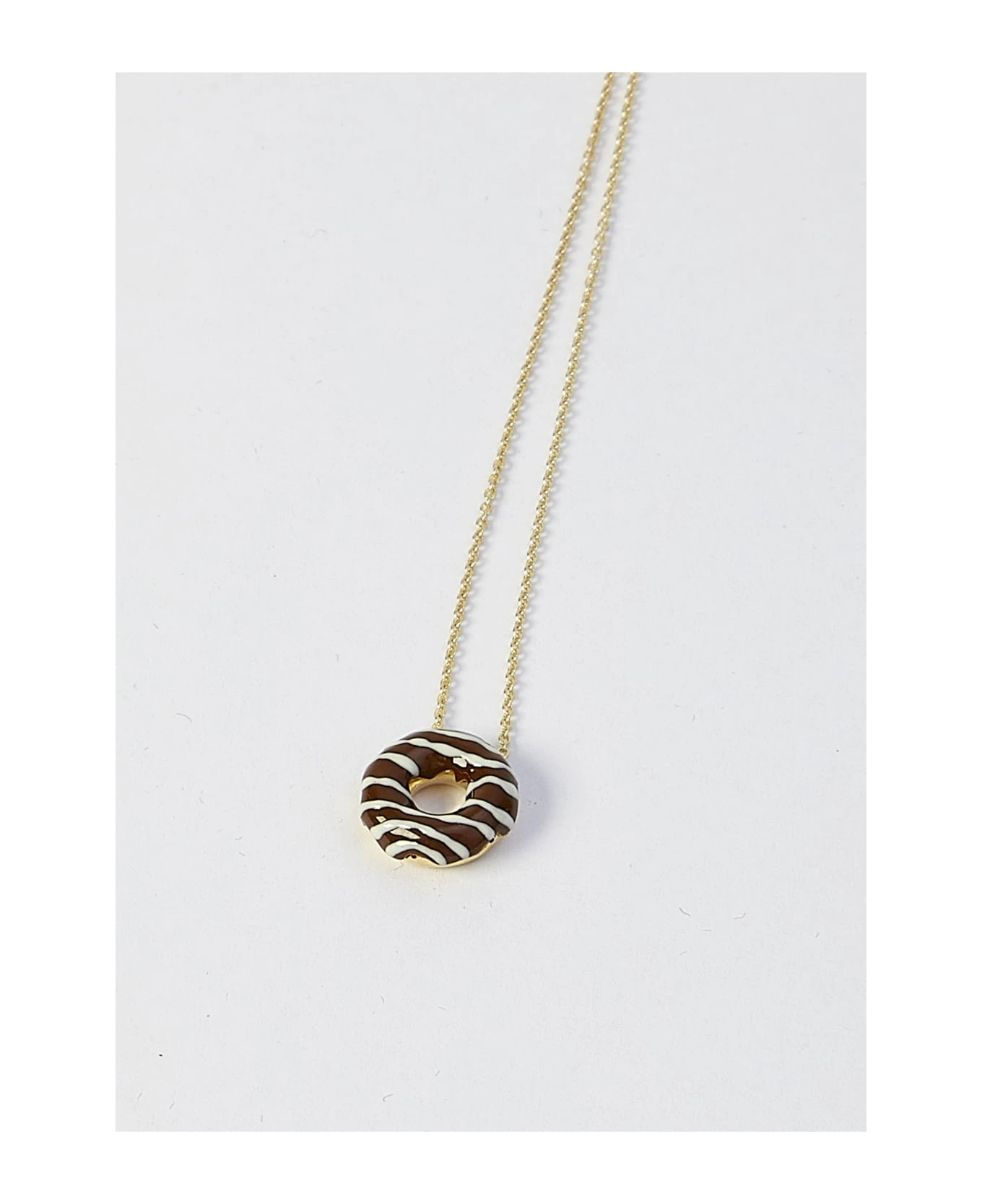 Donut Ice Glazed Diamonds necklace in 9KT yellow gold, hand-painted in brown with enamel. Rolo chain with ring clasp. Adjustable length.