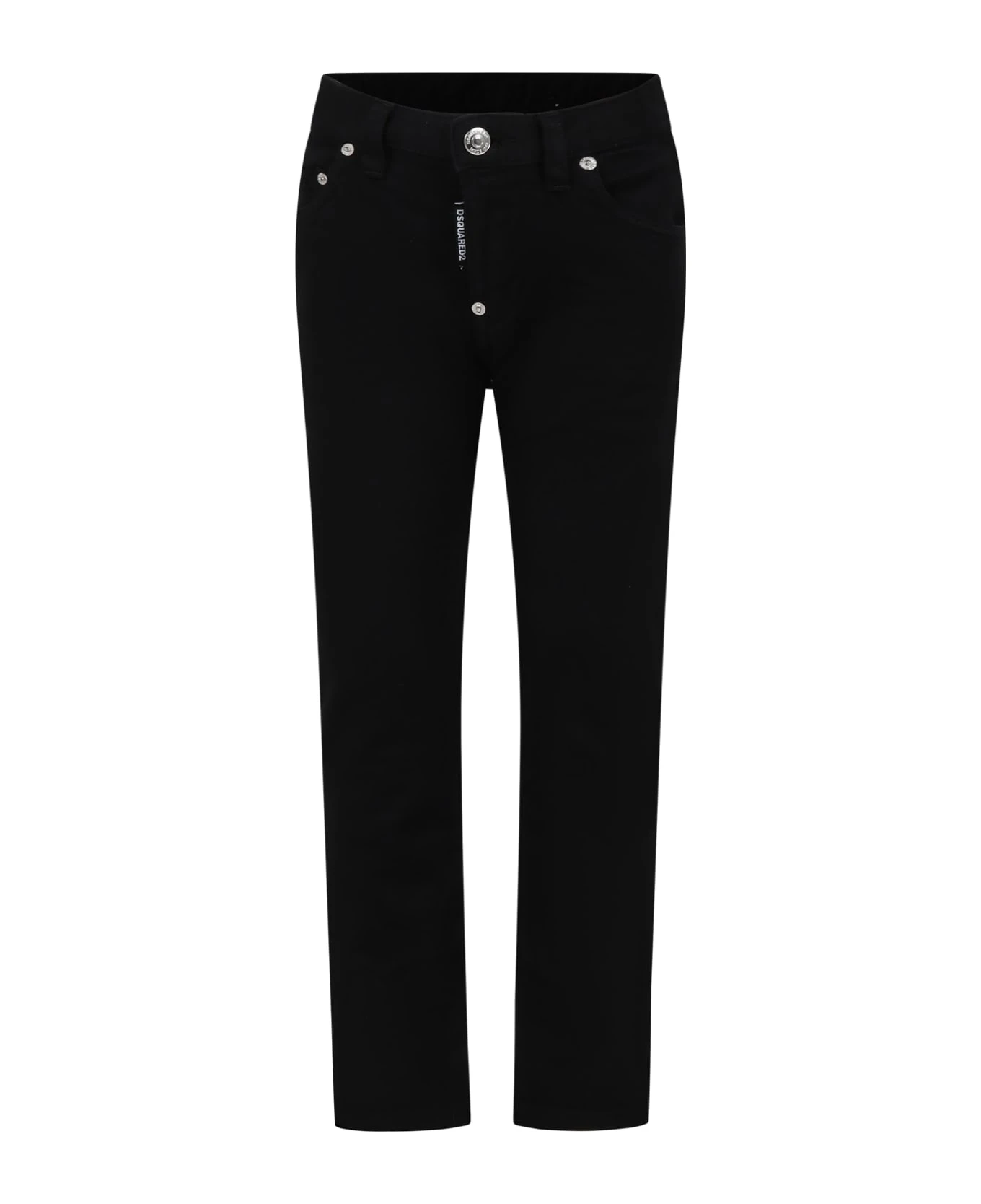Black denim jeans, five pockets, with belt loops, front closure with button. They are embellished with logoed patch on the front and on the back.