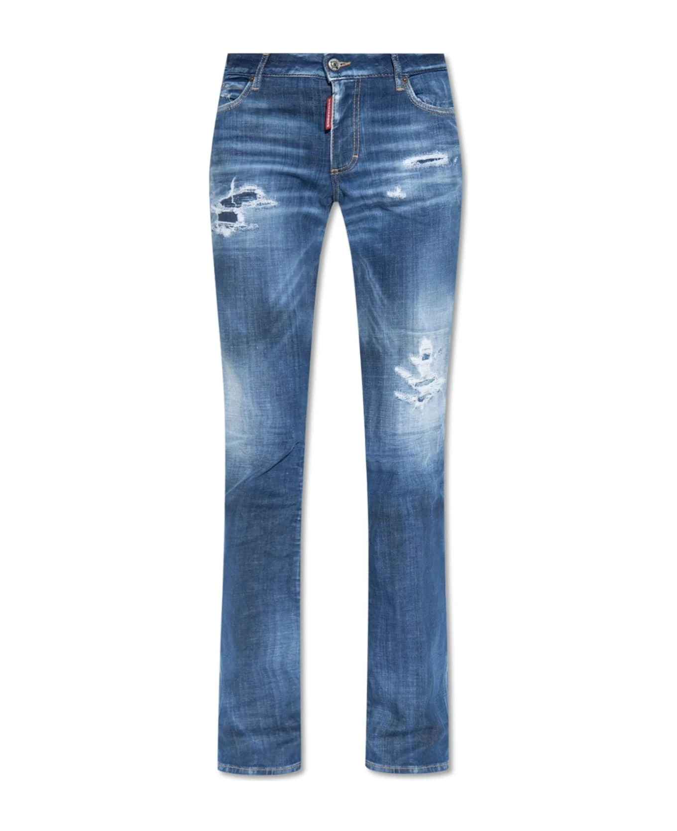 Dark blue ‘Flare Medium Waist’ jeans from Dsquared2. Falling with flared legs, this pair features a zip fly with a button, distressed detailing, classic five pockets as well as a red and white maple leaf application and logo patches.