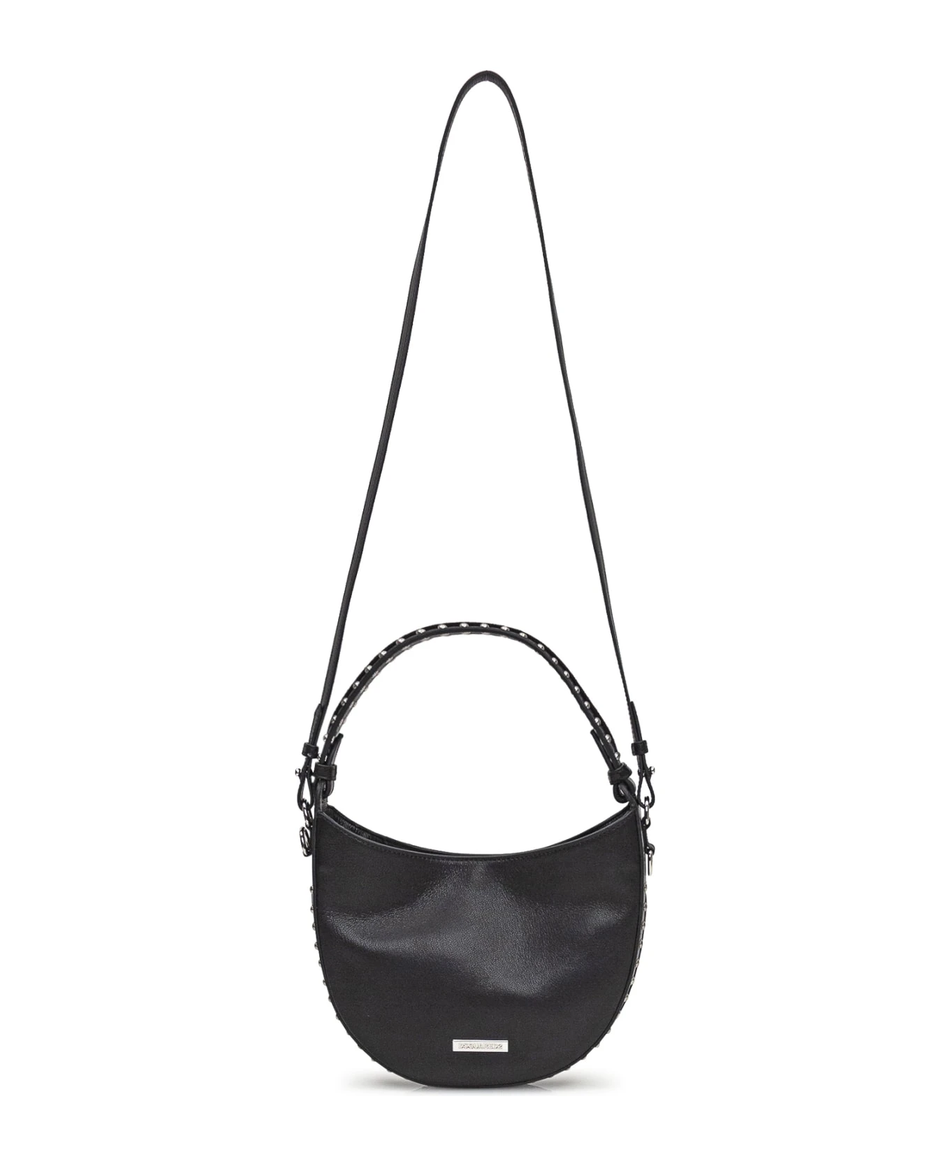 Black hand bag. Removable shoulder strap. Studs on the sides. Metal logo on the front.
