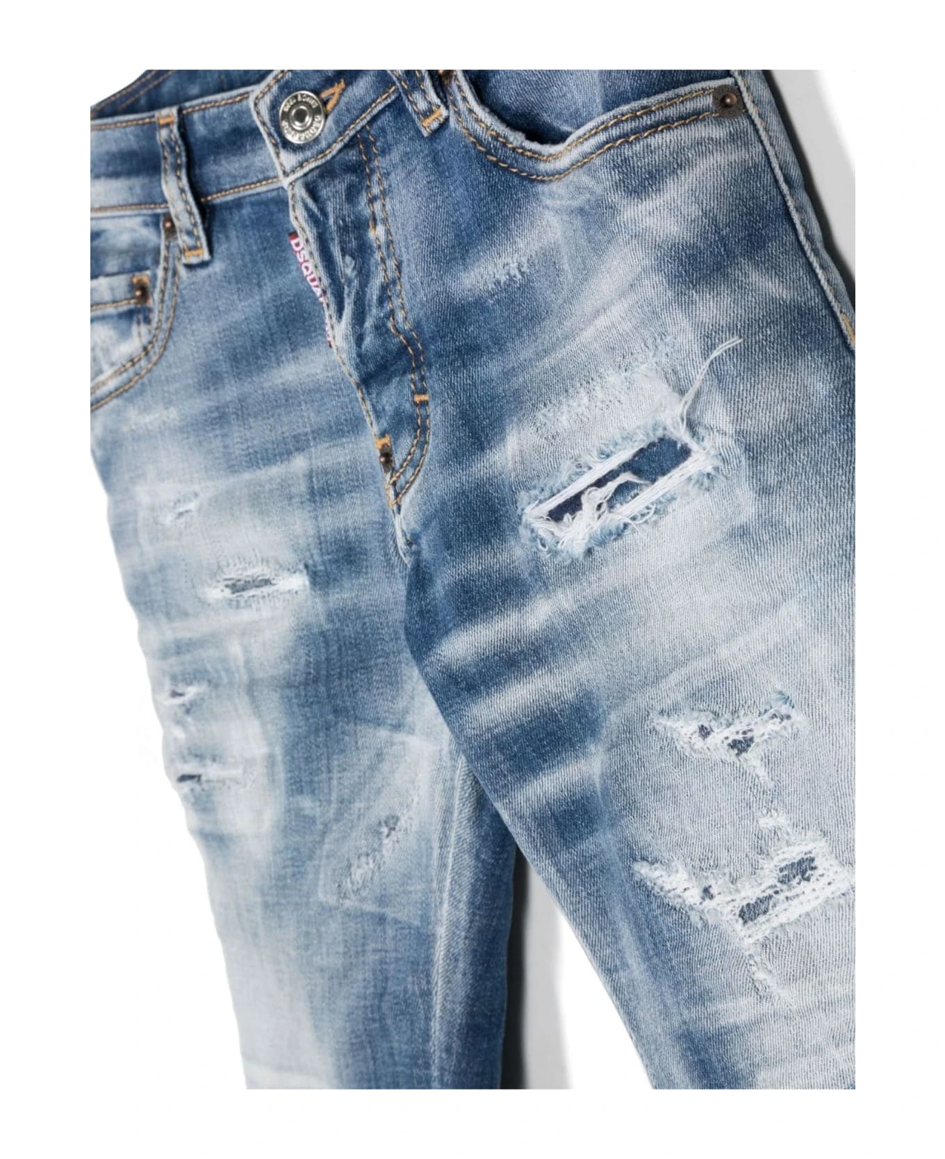 Navy blue stretch-cotton denim, light wash, distressed finish, logo patch to the rear, belt loops, contrast stitching, button fly fastening, classic five pockets