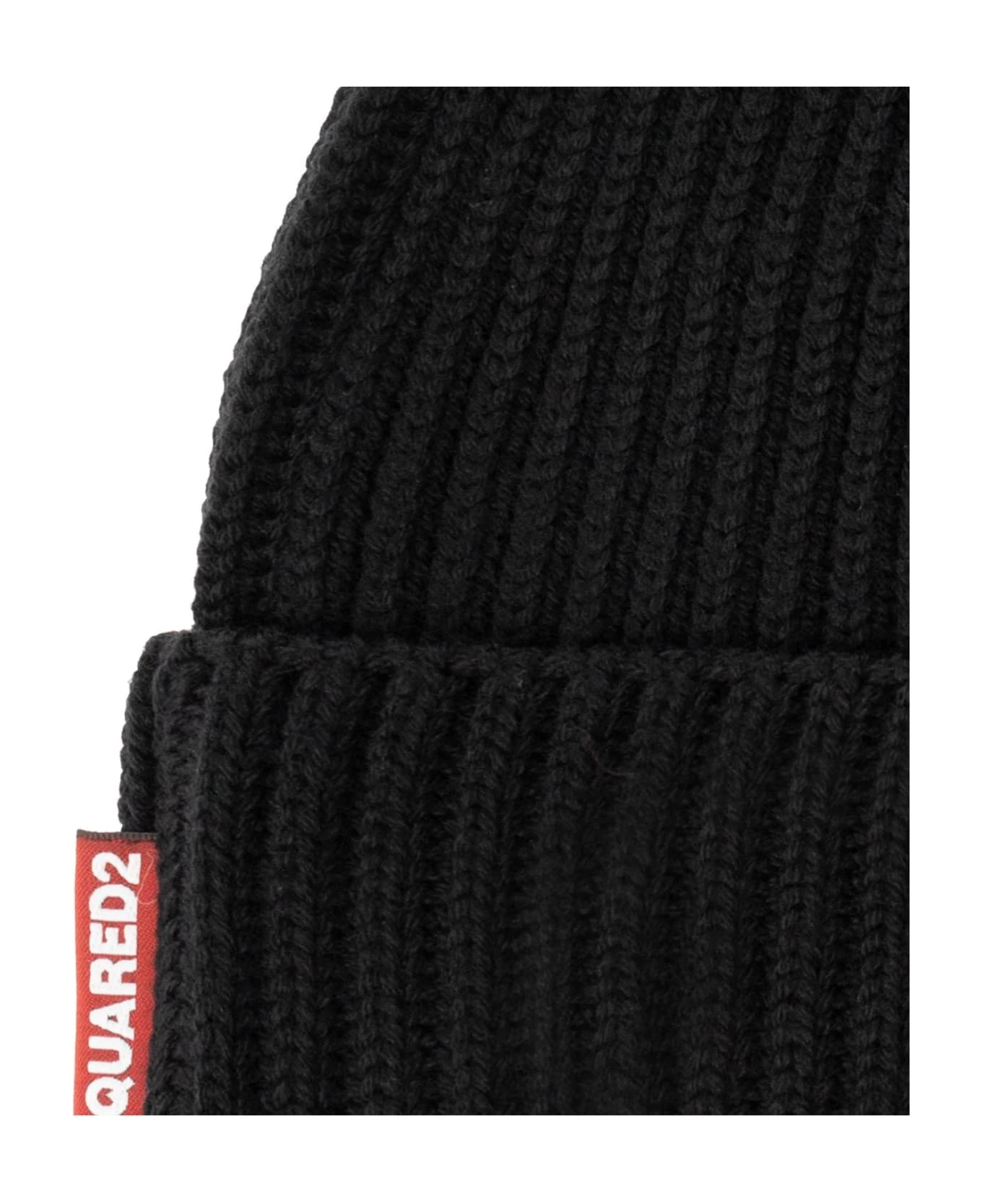 Black beanie & gloves from Dsquared2. Made of wool, both pieces showcase a white and black logo patch.
