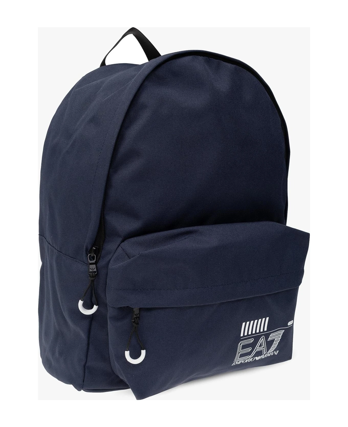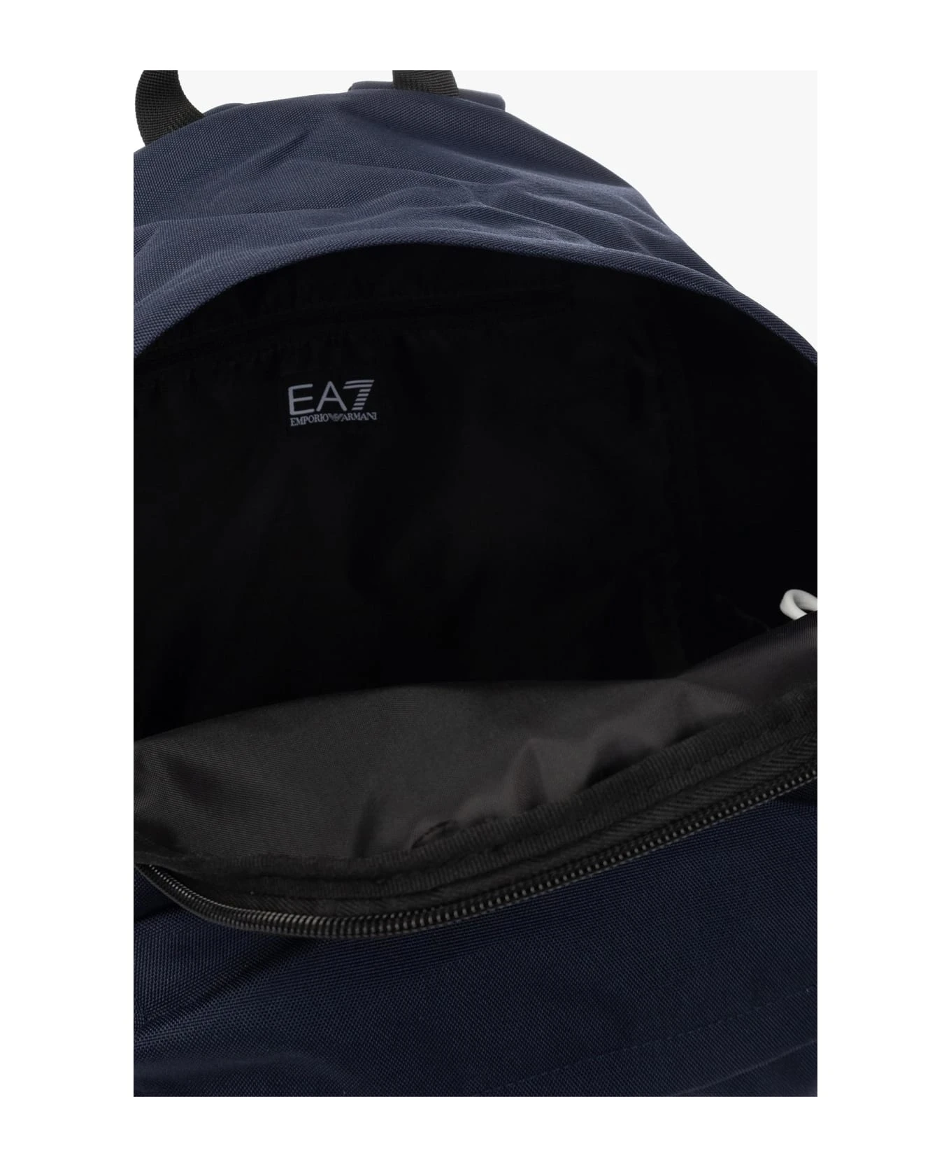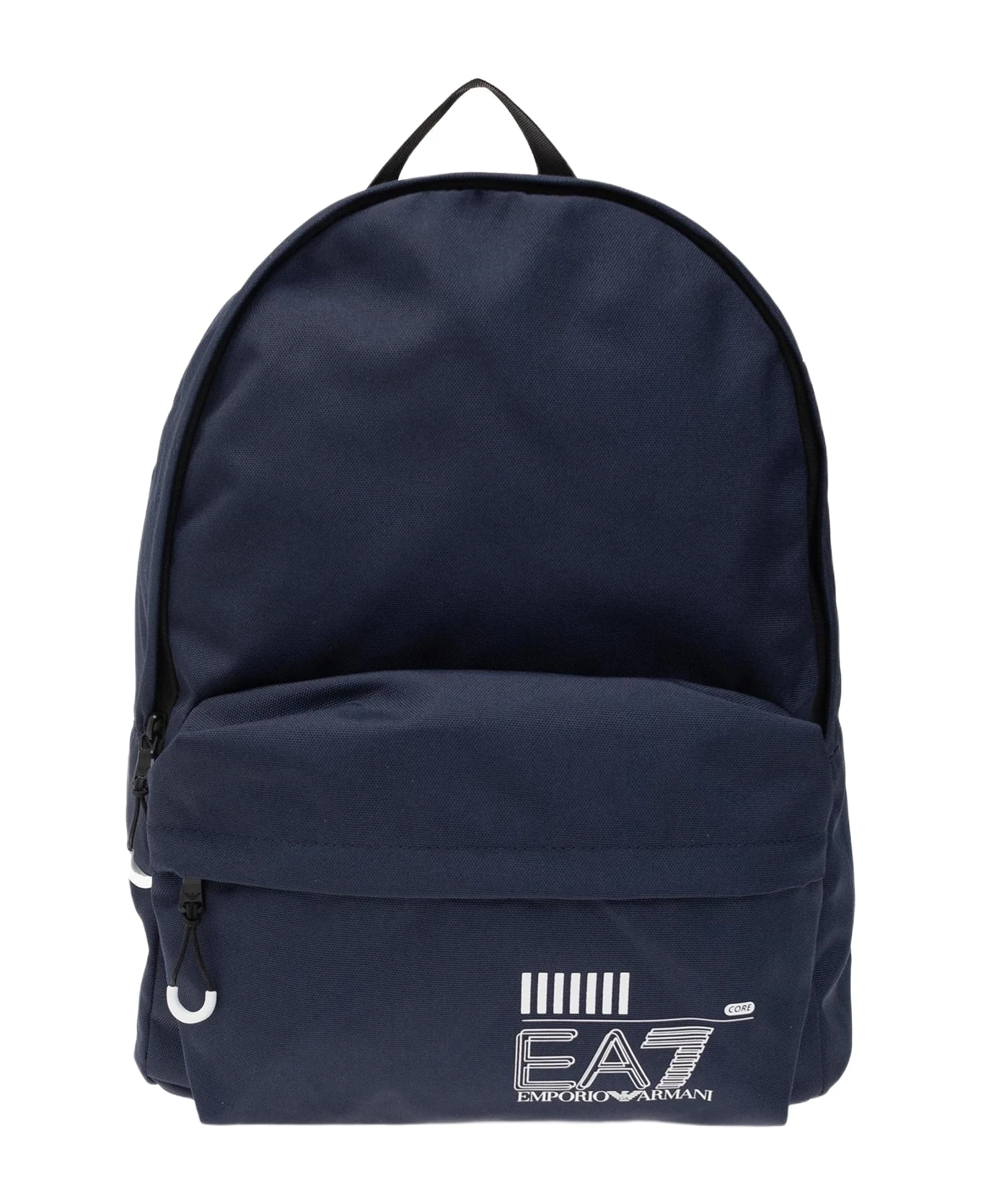 Navy backpack from EA7 Emporio Armani, the ‘Sustainable’ collection. Fastened with a zip, this model is decorated with a white logo print and complete with a zipped front pocket, half-round handle, adjustable shoulder straps, black metal hardware and one
