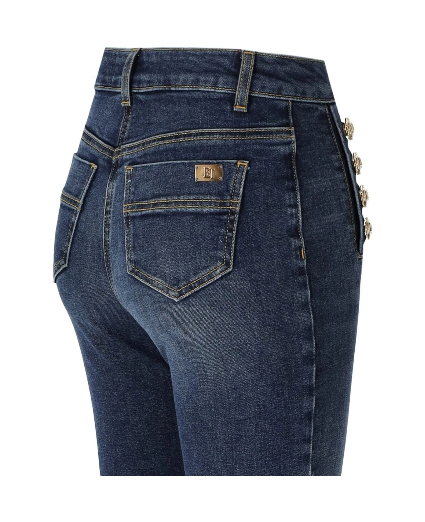 Jeans by Elisabetta Franchi made of dark blue denim, featuring high waist and front pockets embellished with logoed buttons in golden metal. Flared bottom. Composition: 99% cotton, 1% elastane.