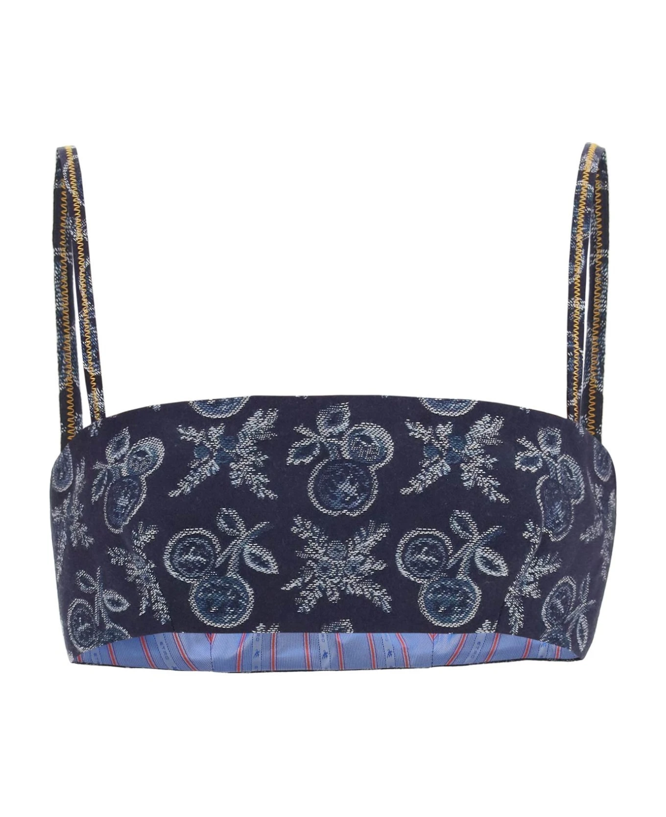 Etro bralette top in jacquard denim featuring a bandeau design with thin straps. Hook-and-eye rear closure, branded lining. The model is 177 cm tall and wears a size IT 40.