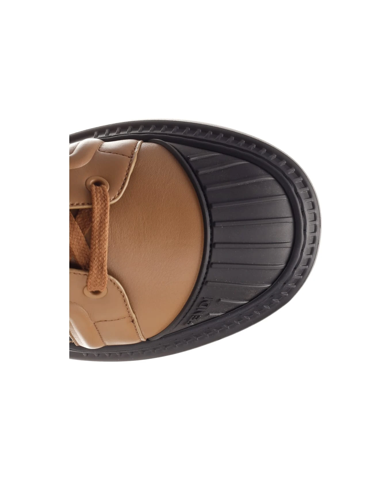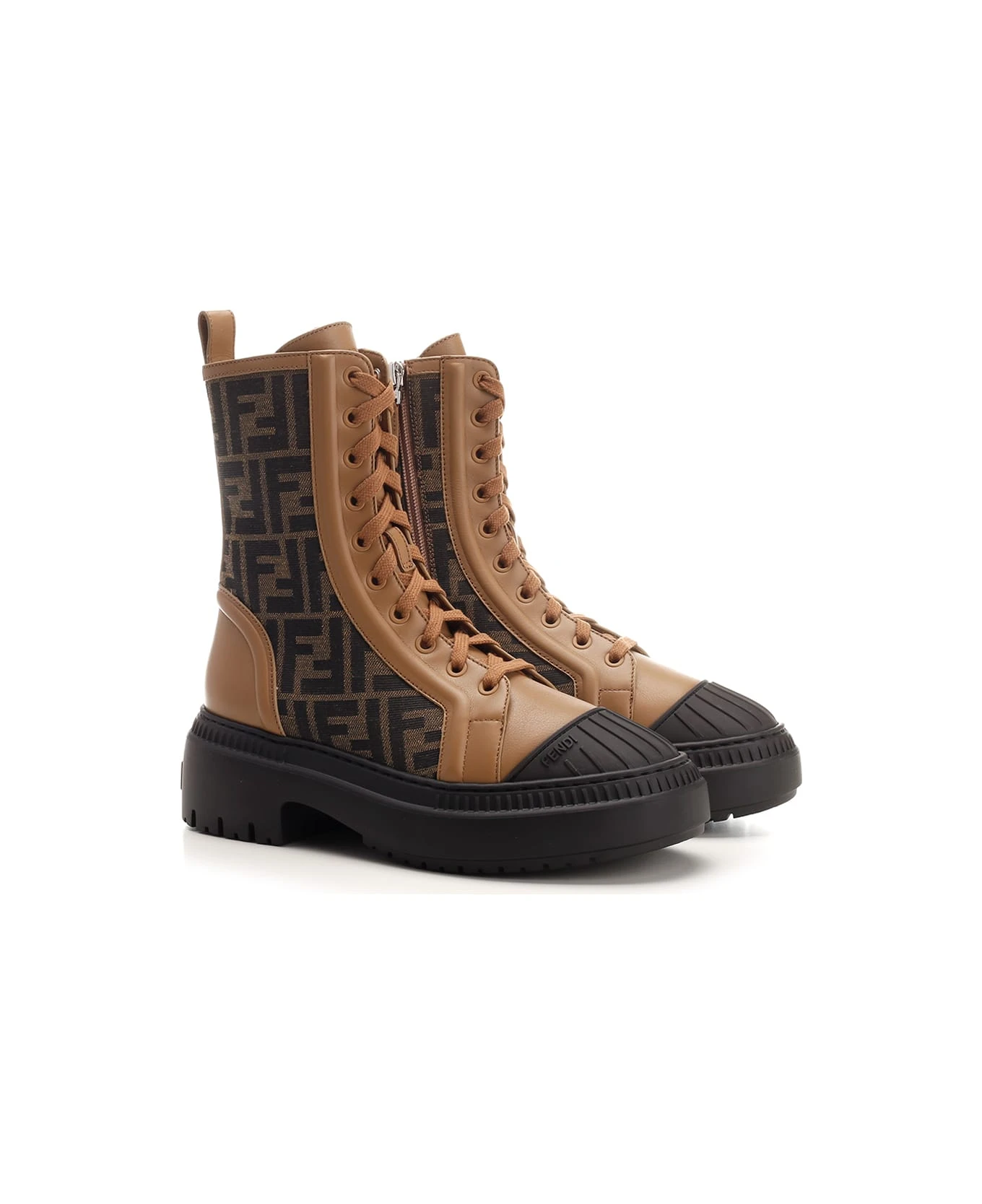 “Domino” combat boot from Fendi in beige leather and brown and tobacco FF jacquardfabric, laces and zip on the inside. Rubber sole with embossed FF motif on the toe.