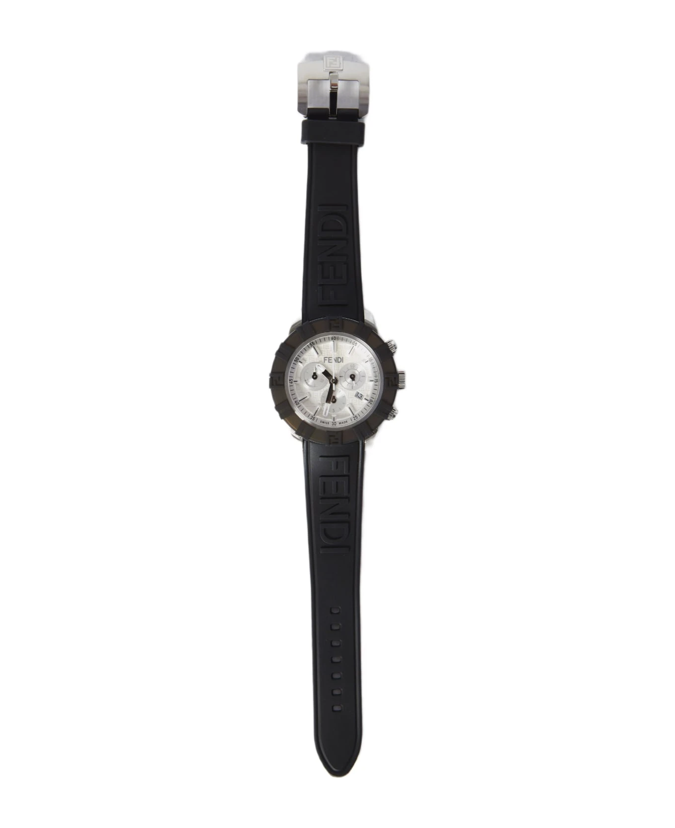 Fendastic watch with round 45mm case made of shiny and satin-finish black and silver stainless steel, with transparent silicon bezel. It features plated dial with FF print, three sub-dials, indices and details in black and silver hands. Band in grey FKM rubber, 22/18mm, with raised Fendi logo and silver-color stainless steel folding buckle.
