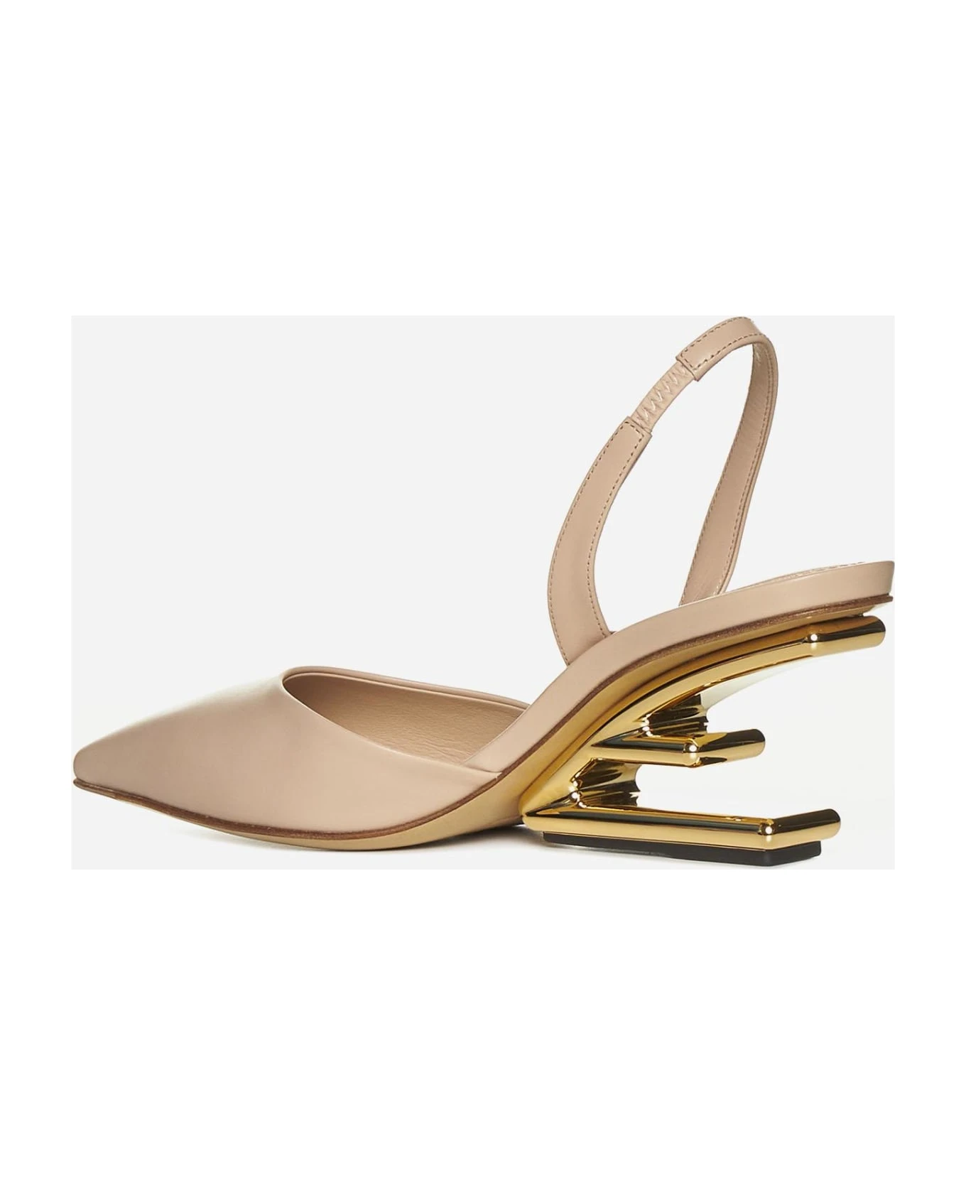 Fendi First blush pink leather slingback pumps featuring a pointed toe, elasticated back strap, leather lining, insole and sole and F logo midi heel in gold-tone metal.