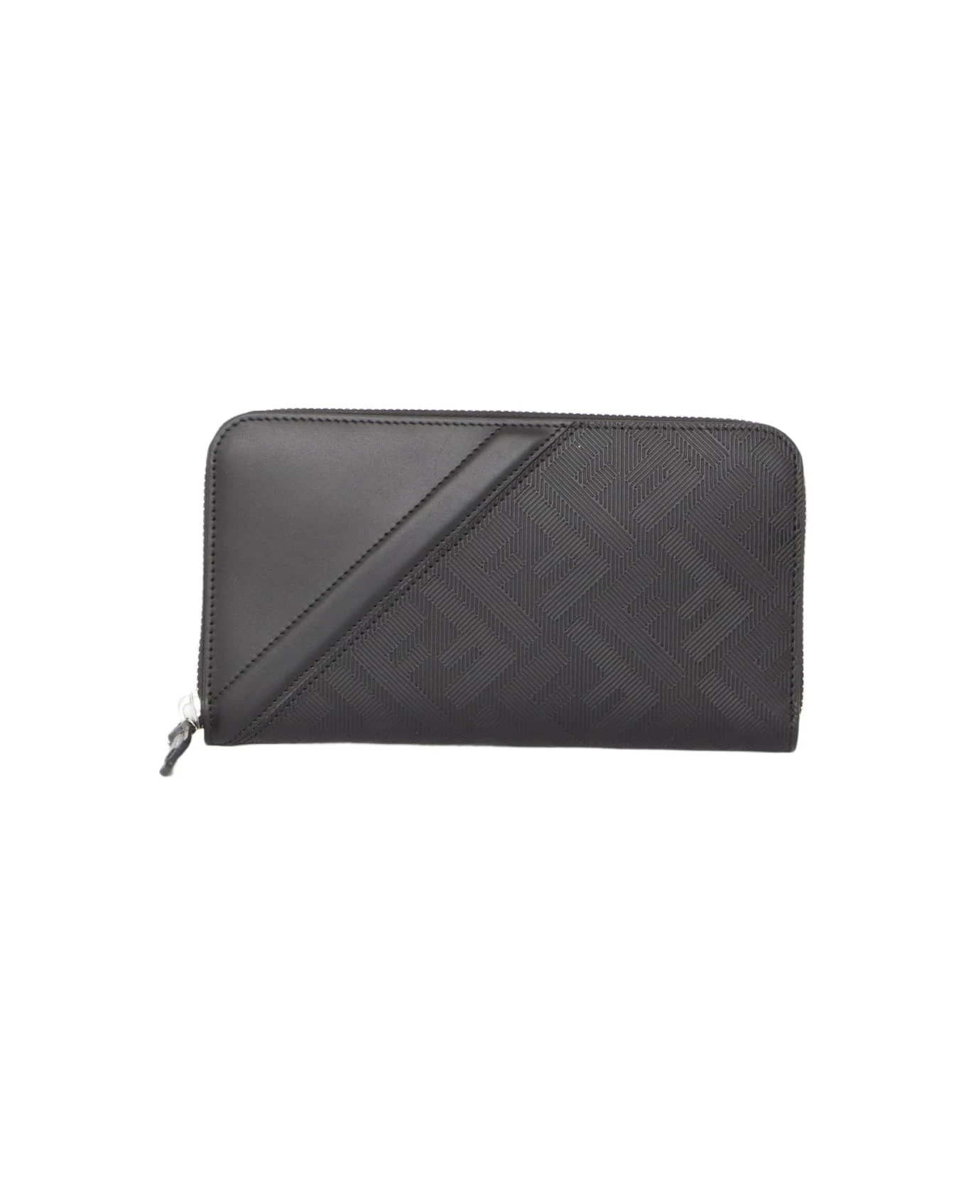 Fendi Shadow Diagonal Zip Around wallet in black leather with textured FF motif and black leather diagonal detail. zip closure, three gusseted compartments, one zipped pocket and eight card slots.