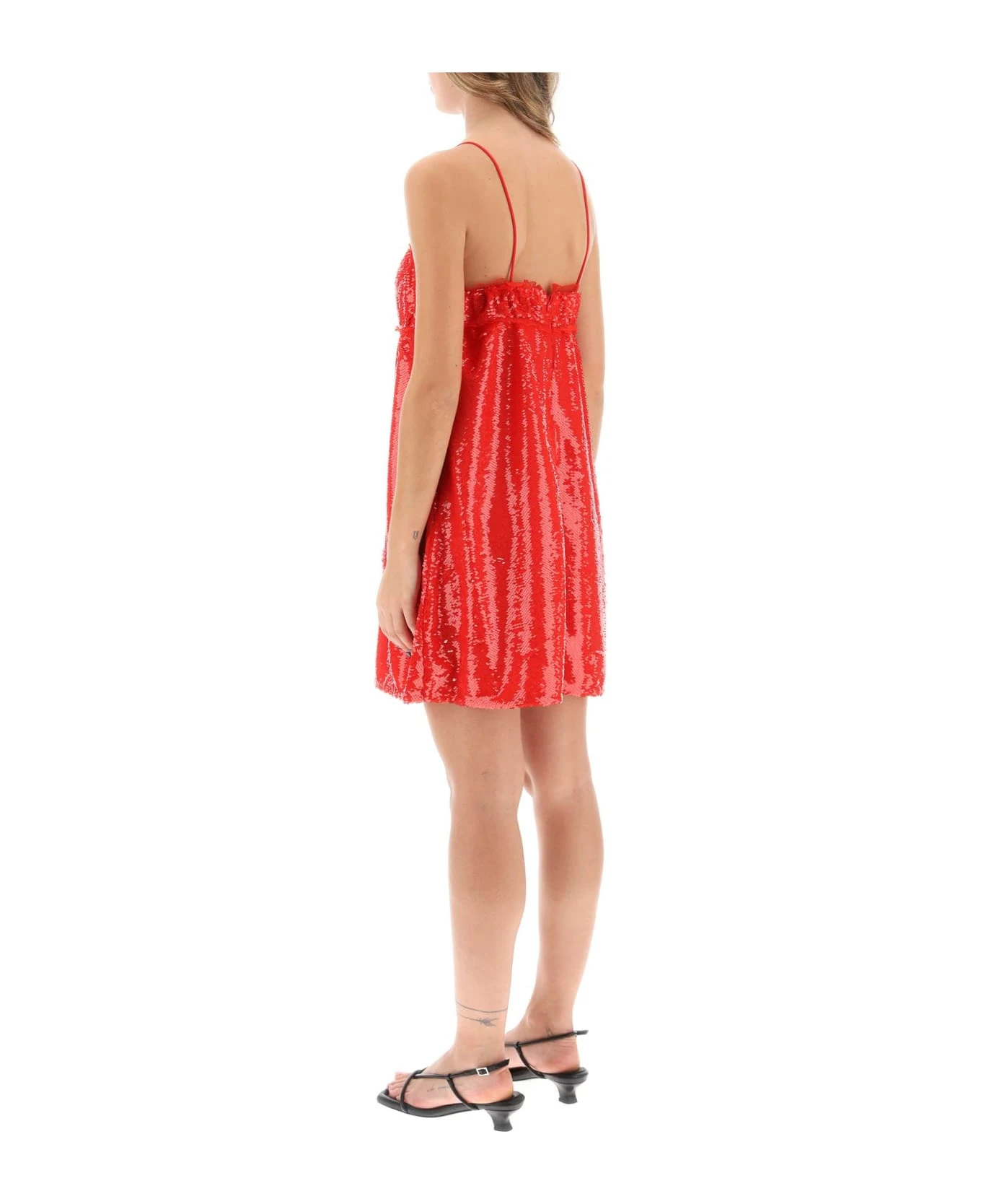 Sleeveless mini dress by Ganni crafted in sequin-studded techno knit, with thin fishnet-knit trims. It features adjustable spaghetti straps and back invisible zipper closure. Lined in recycled polyester on the inside. Straight silhouette with empire waistline. The model is 177 cm tall and wears size EU 34.