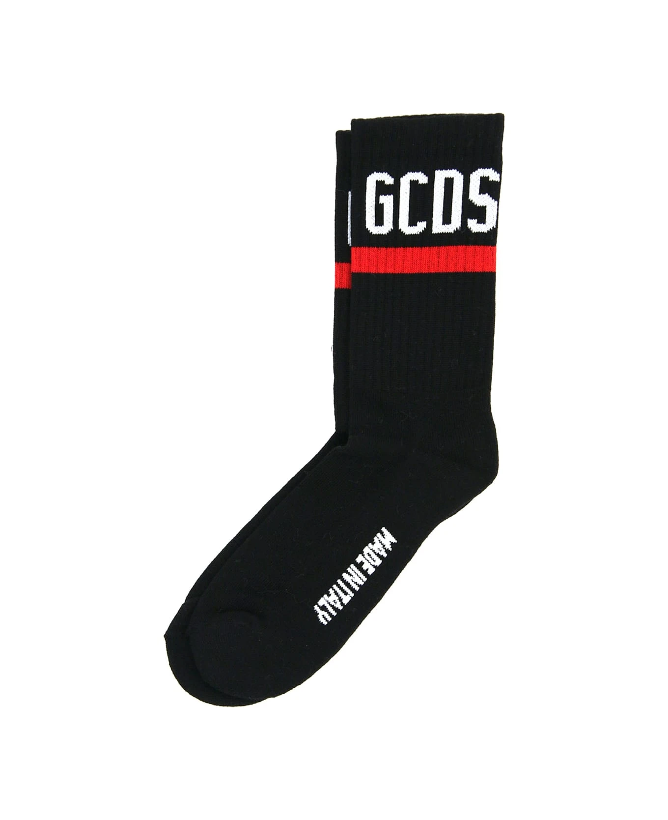 GCDS ribbed stretch cotton socks with contrasting stripes and jacquard logo. Cotton terry inner footbed.