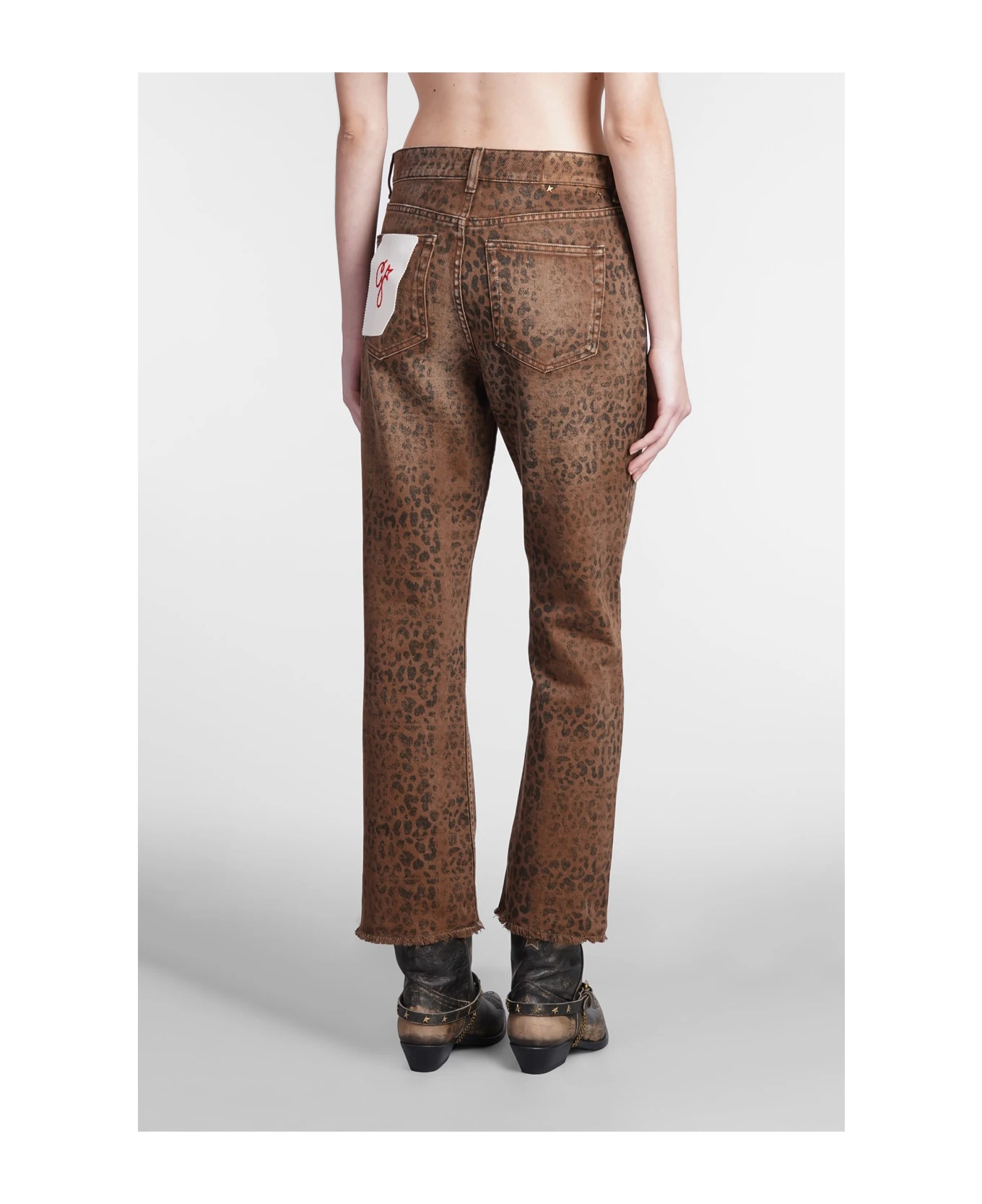 Jeans in Animalier denim, button and zip closure, waist belt loops, five pockets, destroyed hem, animalier pattern, 65% polyester 35% cottone, Made in Italy, model is 180 cm and wears size 27