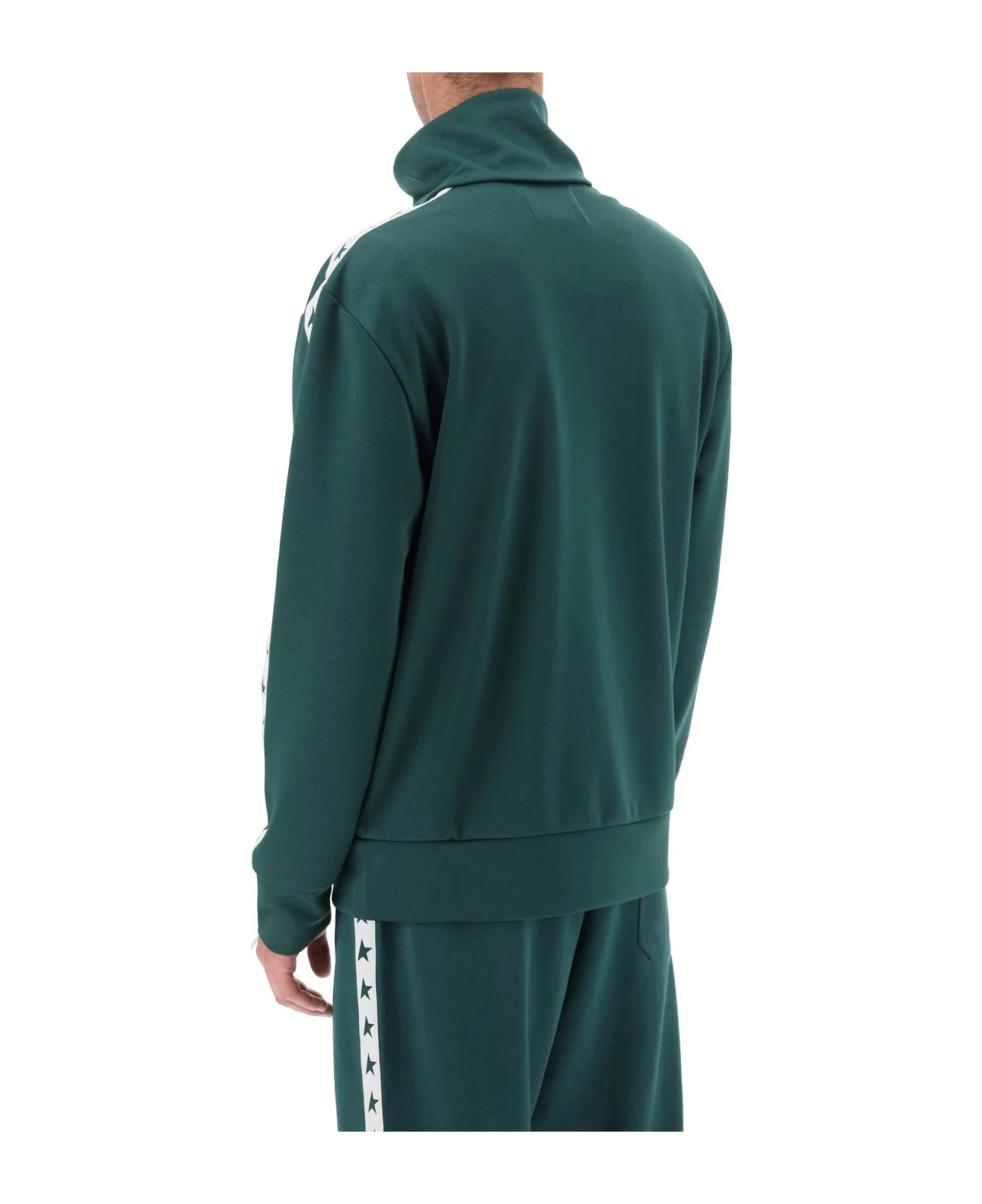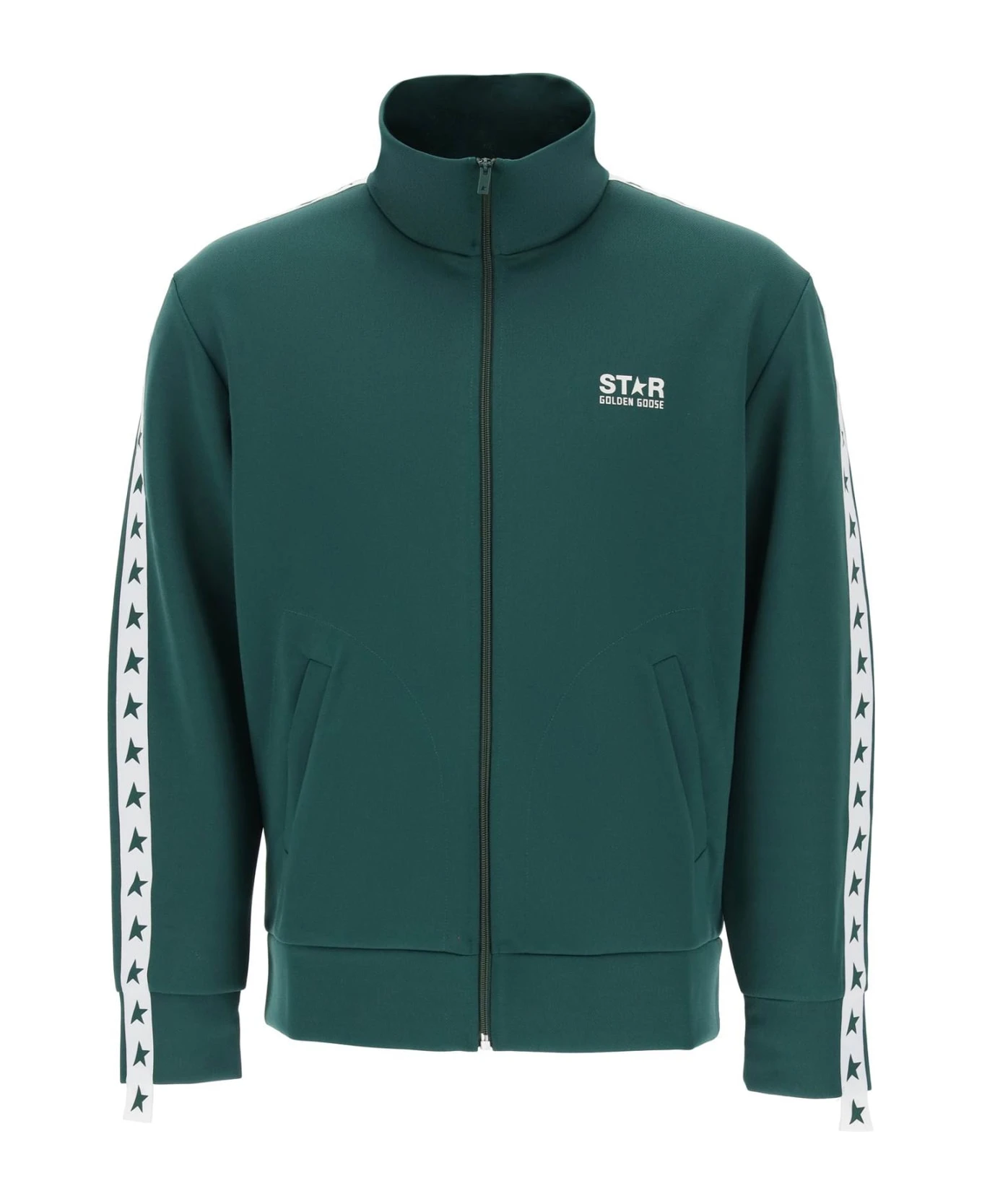 Golden Goose sweatshirt crafted in technical jersey with contrasting bands patched at sleeves and decorated with stars. It features high neck, front zipper fastening and side slanted pockets. Enriched by contrasting logo print at chest. Regular fit with straight cut. The model is 187 cm tall and wears size L.