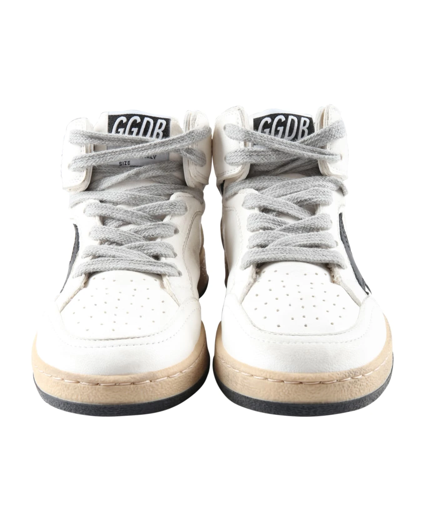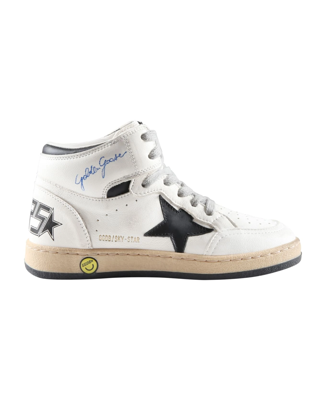 Chunky white sneakers, with lace-up closure on the front, and beige and black rubber sole. They are embellished with iconic black star, blue logo and golden logo on the side, black Kers writing on the back and iconic all-over dirty effect.