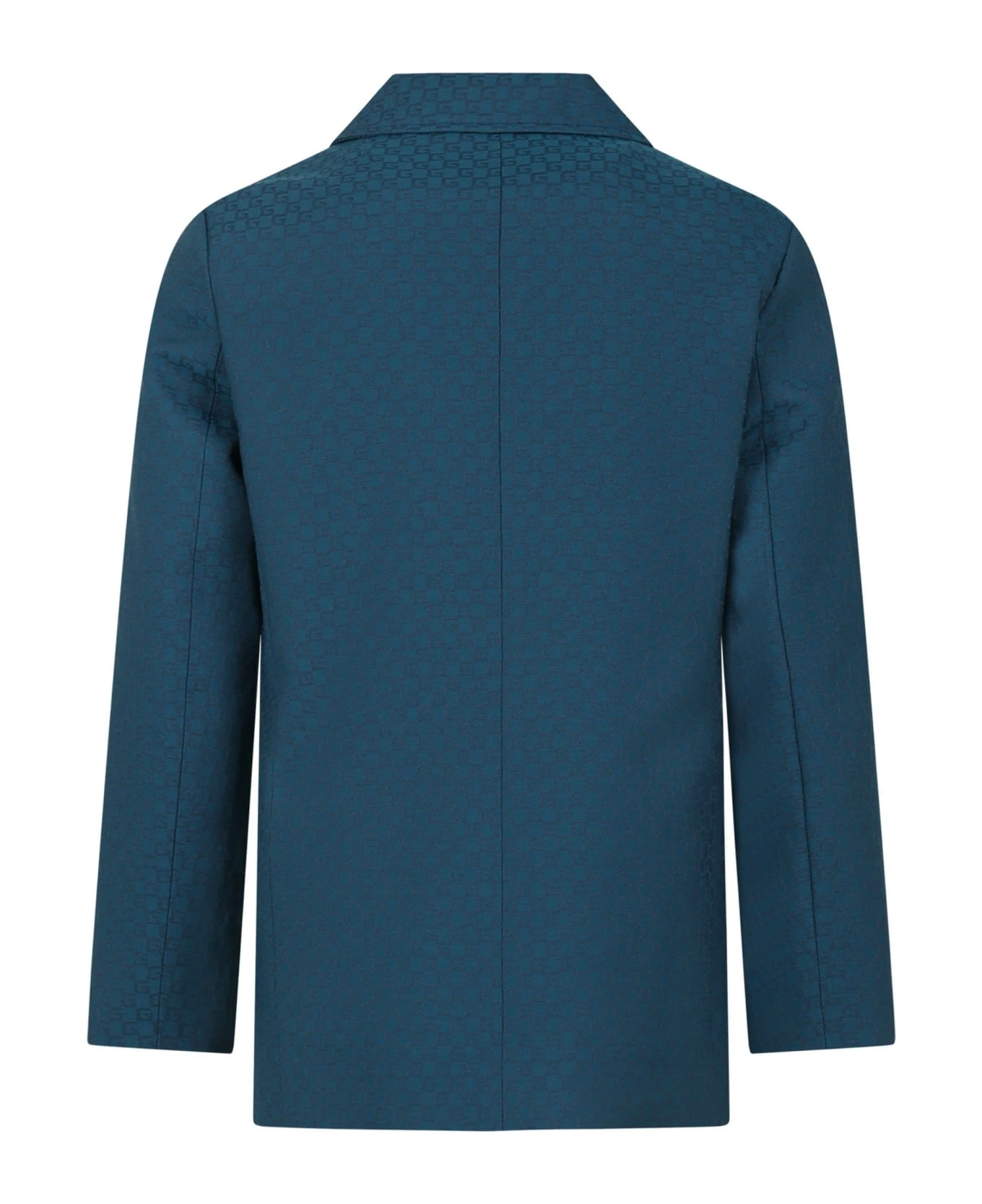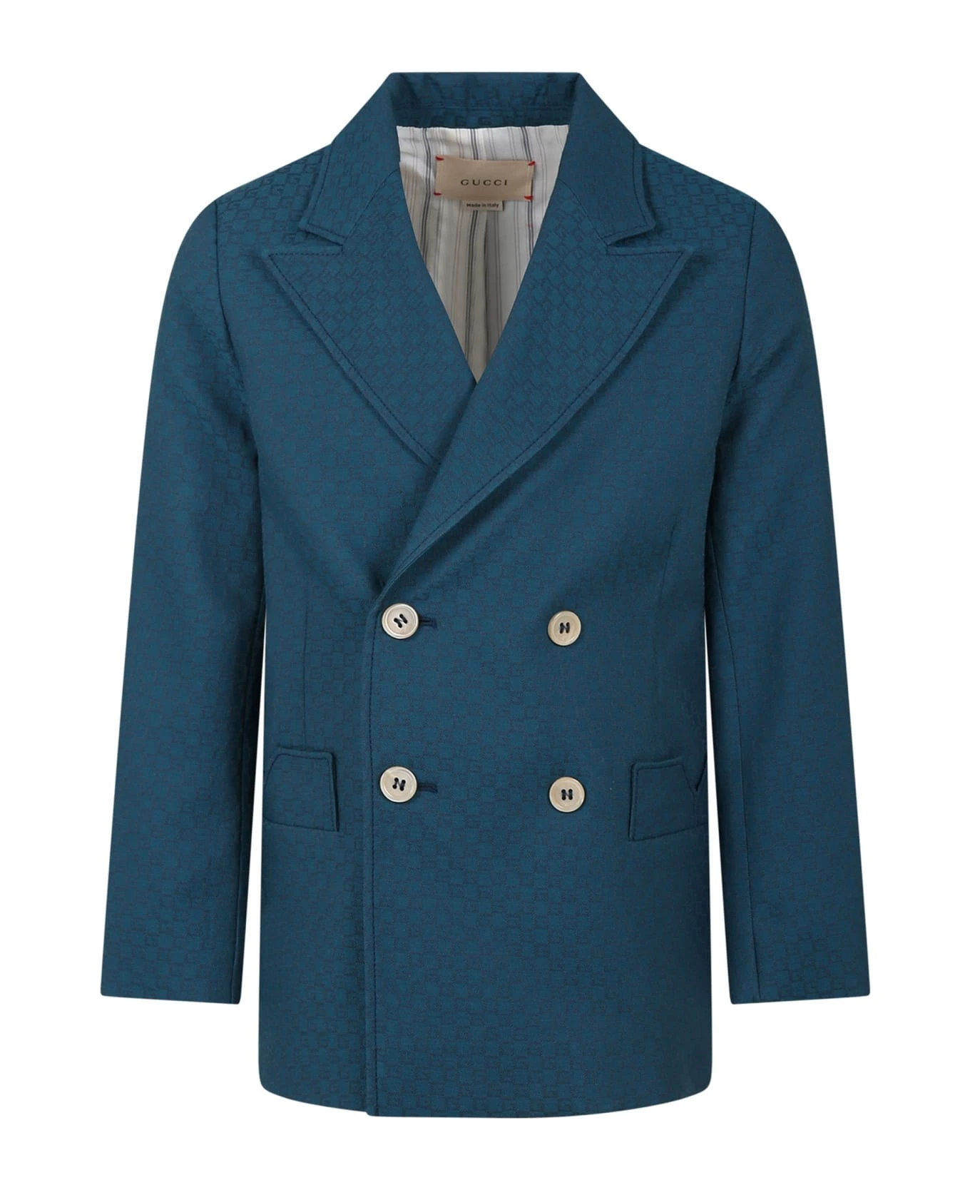 Blue double-breasted jacket in wool blend, with long sleeves, lapel collar, front closure with buttons and side pockets. It is embellished with logo all-over.