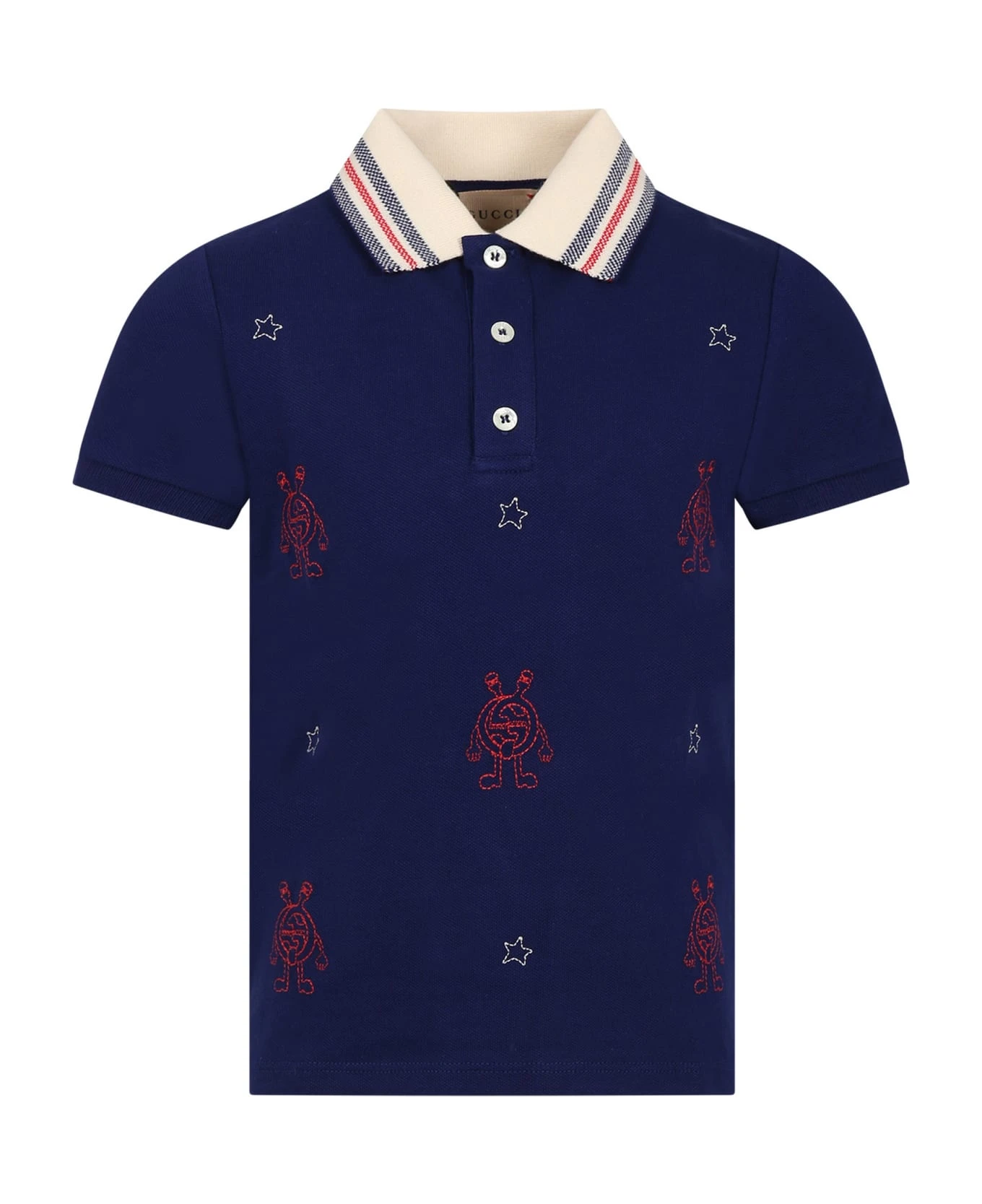 Blue polo shirt in cotton piqué, with short sleeves, classic collar, front closure with buttons. It is embellished with Gucci monster embroidery with GG cross and stars, on the front.