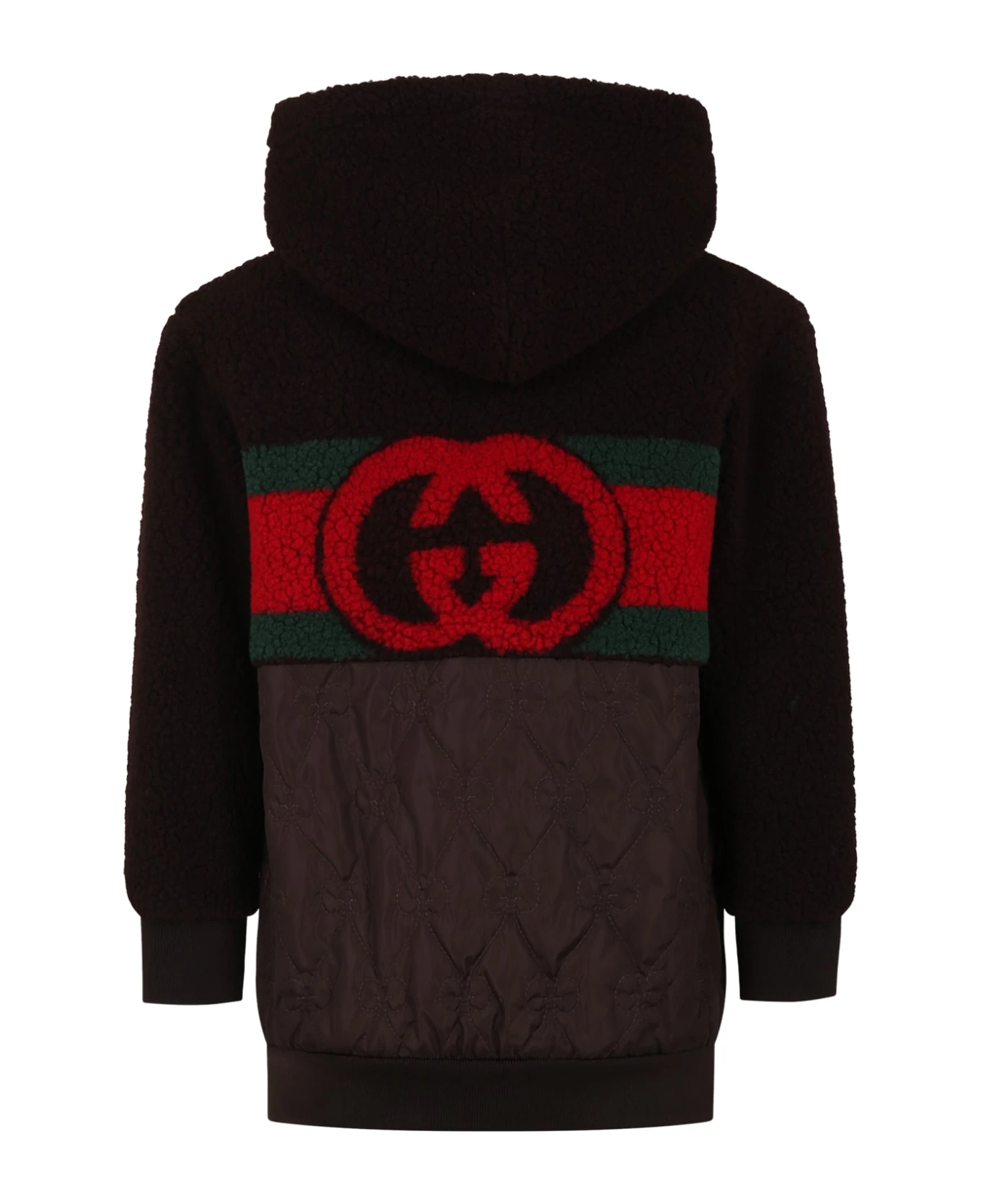 Brown eco-fur coat, with long sleeves, hood, front zip closure and side pockets, ribbed cuffs and hem, quilted and padded bottom. It is embellished with interlocking GG on the back and Web details on the front and back.