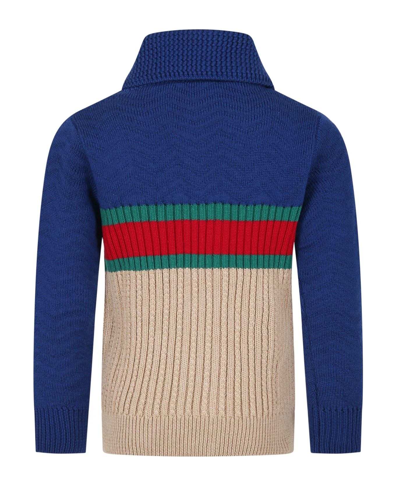 Blue and beige chucky knitted cardigan with different kinds of works, closure with buttons and iconi green and red Web detail.