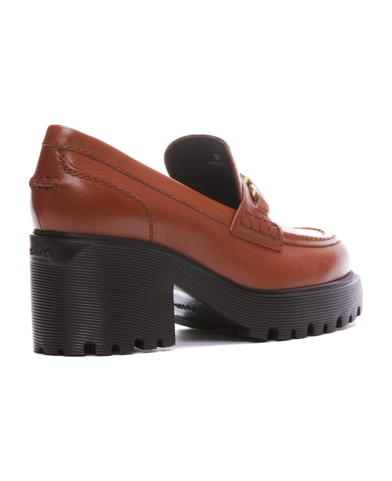 Hogan brown H649 pump loafers, leather upper and rubber sole, round toe, large heel, golden logo on front