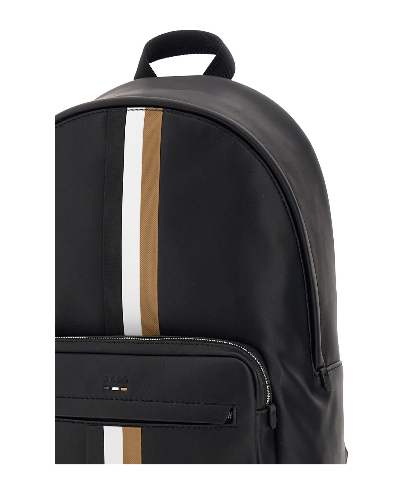 Men’s by BOSS ‘Ray Backpack’ vegan leather backpack, black colour, external pockets with zip, adjustable padded shoulder straps, compartment with zip closure, internal pockets, shiny silver metallic finishes, front embossed logo, top handle, iconic multicolor stripes. Dimensions: height 40cm, length 29cm, depth 13cm.