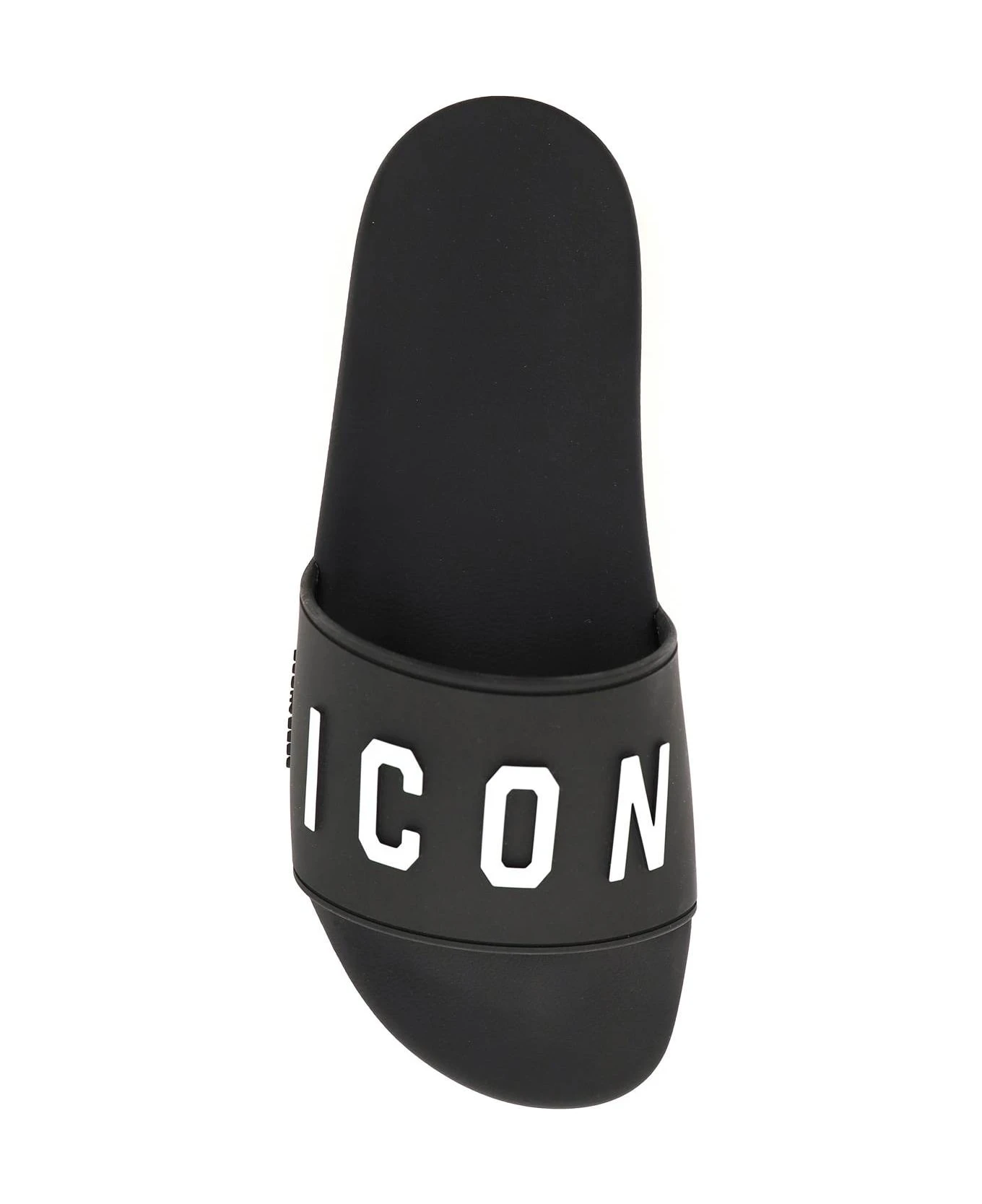 DSquared2 rubber slides with contrasting raised “ICON” logo on the upper. Moulded footbed, rubber sole with debossed logo pattern on the bottom.