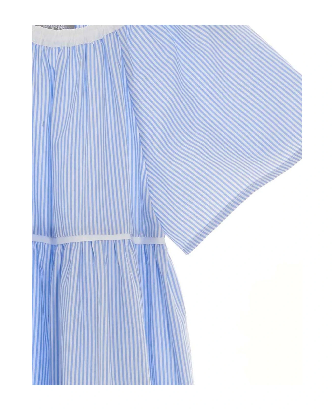 Stripe cotton dress with scoop neck, short sleeves, tiered skirt, bow detail at the back.