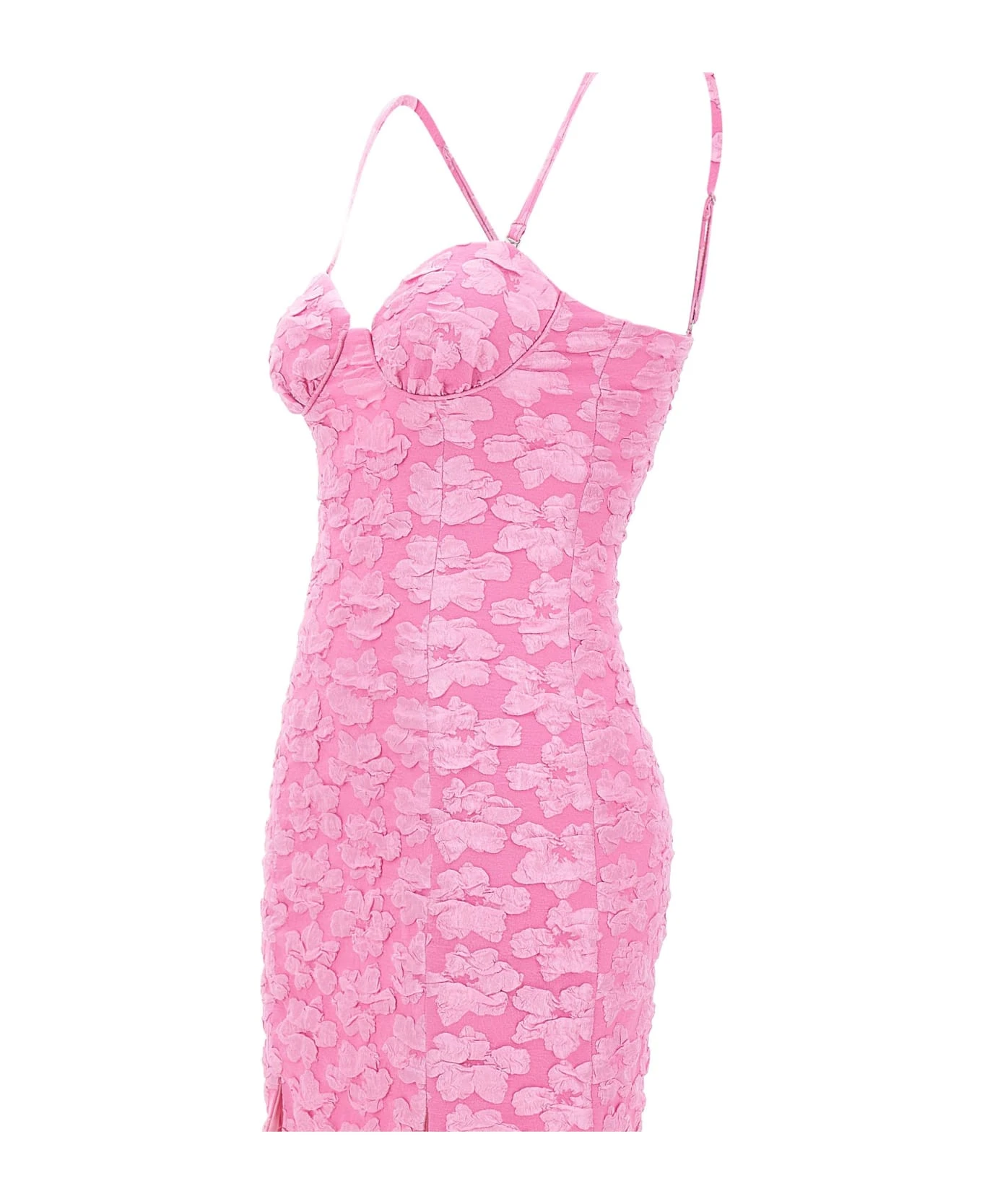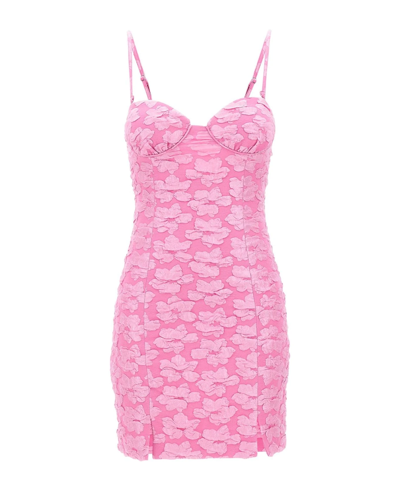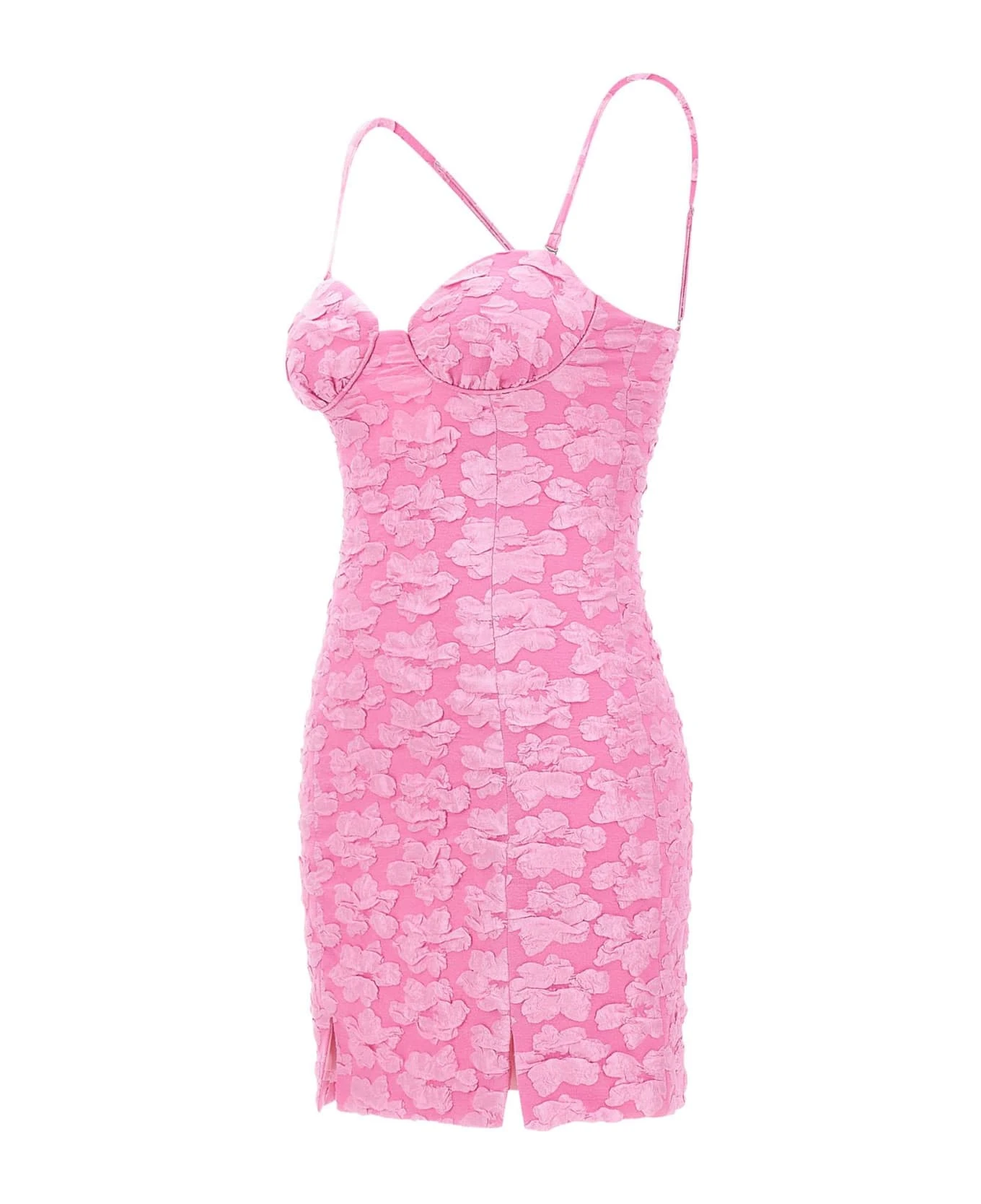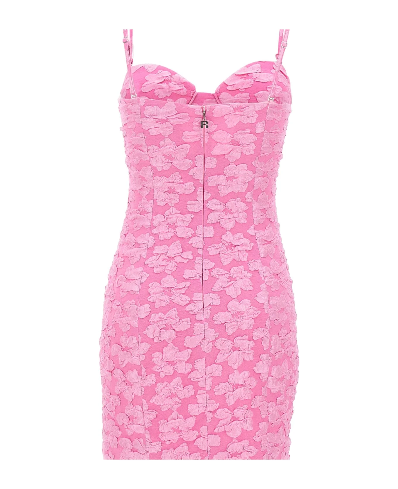 Rotate Birger Christensen “Jacquard Flower” woman dress, fuchsia pink, mini length, sweetheart neckline, thin removable shoulder straps, solid color inner lining, two slits on hem on front, concealed zip fastening on back, slim fit, ideal for a very feminine and romantic.