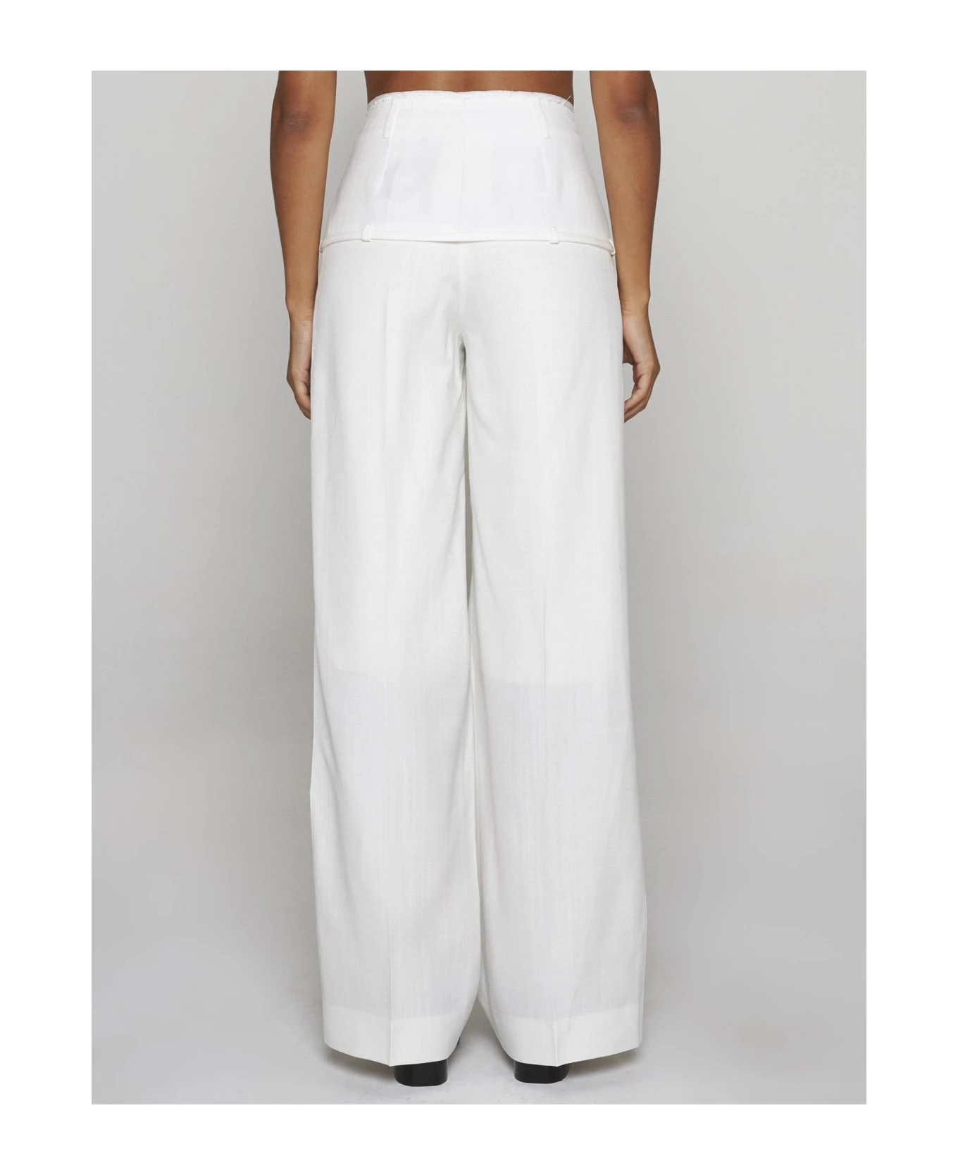Jacquemus’ Criollo white viscose trousers featuring high waist, belt loops, concealed zip and button fastening, low belt loops with thin belt and silver-tone metal buckle, low side pockets, wide and straight leg with ironed crease and raw cut edges.