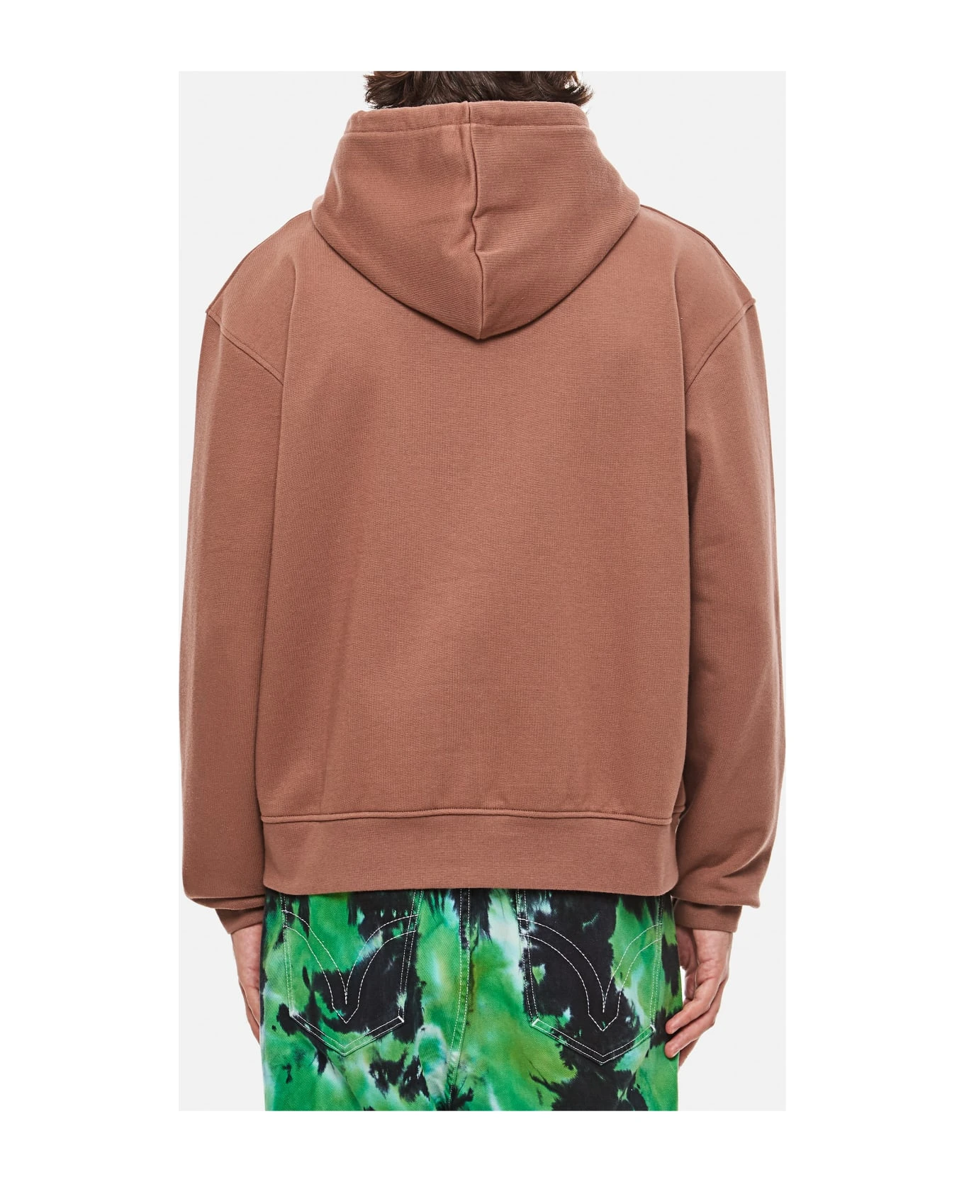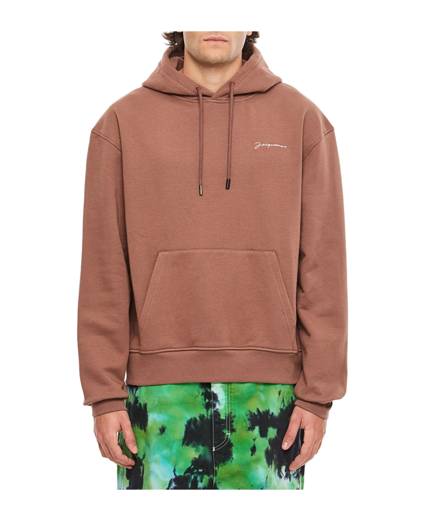 Adjustable drawstring hood. Round square metal engraved cord tips. Embroidered logo on the chest. Kangaroo pocket. Ribbed cuffs and hem. Regular fit. Color: brown.