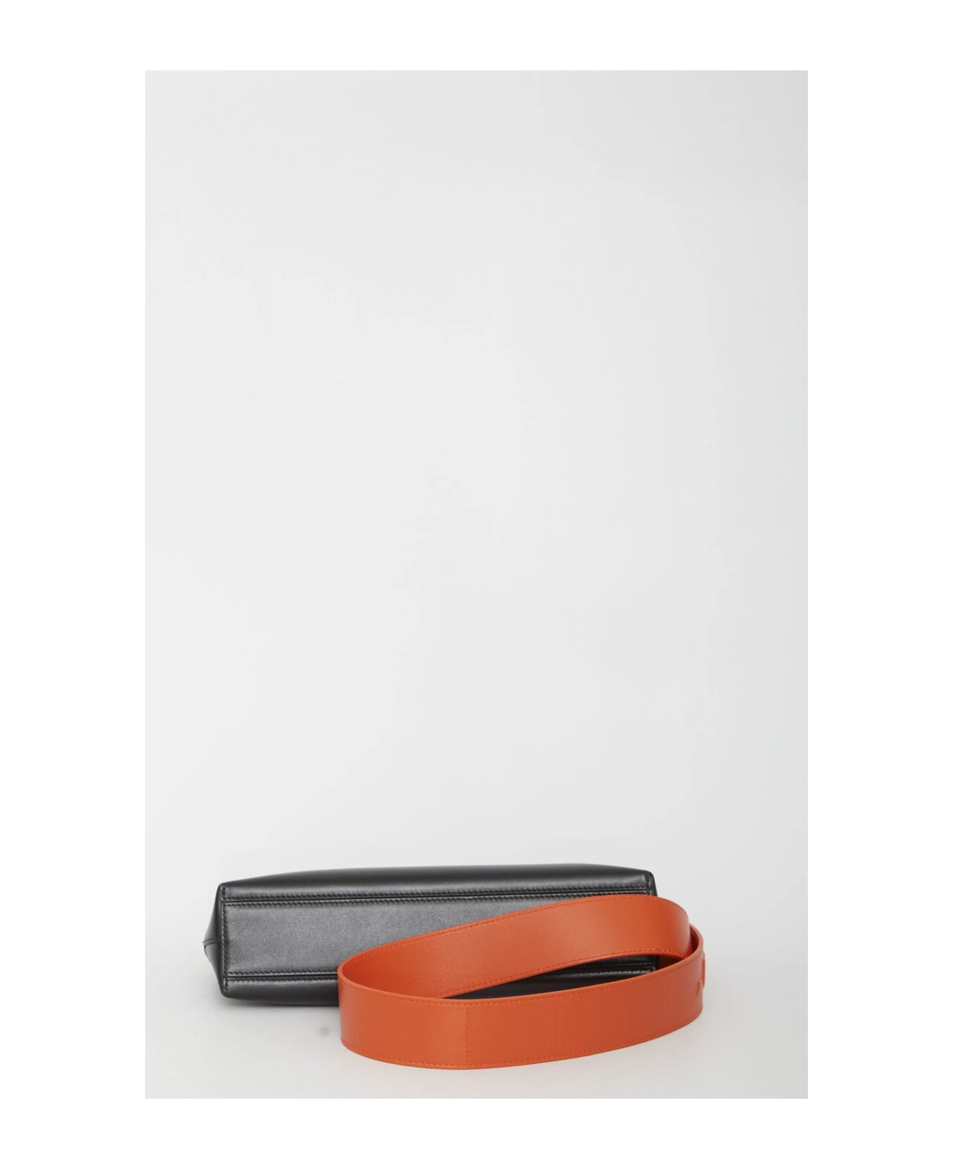 Goji Small bag in black nappa with gold-tone metal hardware. It features embossed Jil Sander logo on the front, orange leather shoulder strap with logo, one additional adjustable and detachable shoulder strap in black leather, clasp closure, one main interior compartment and one interior zip pocket.
