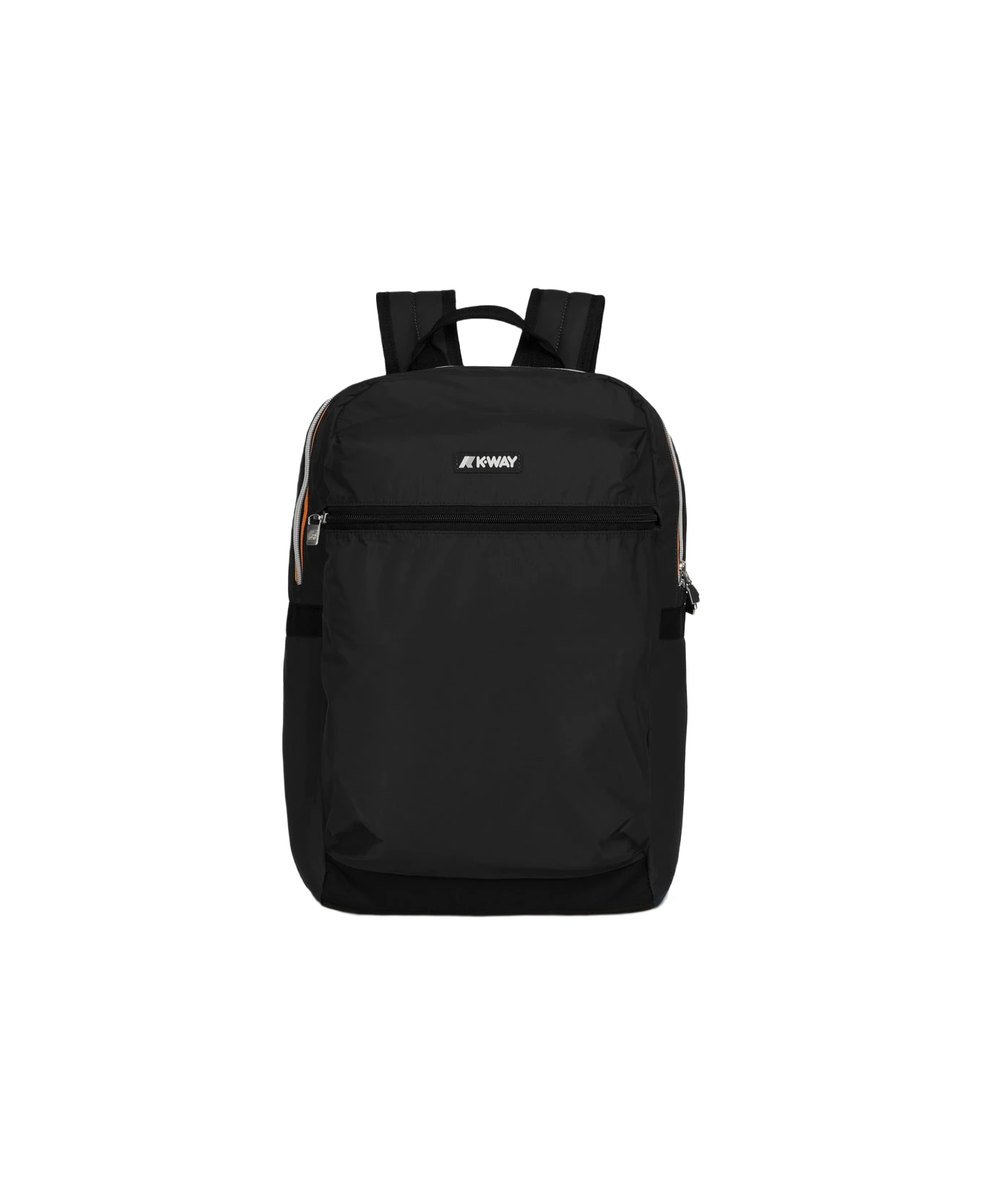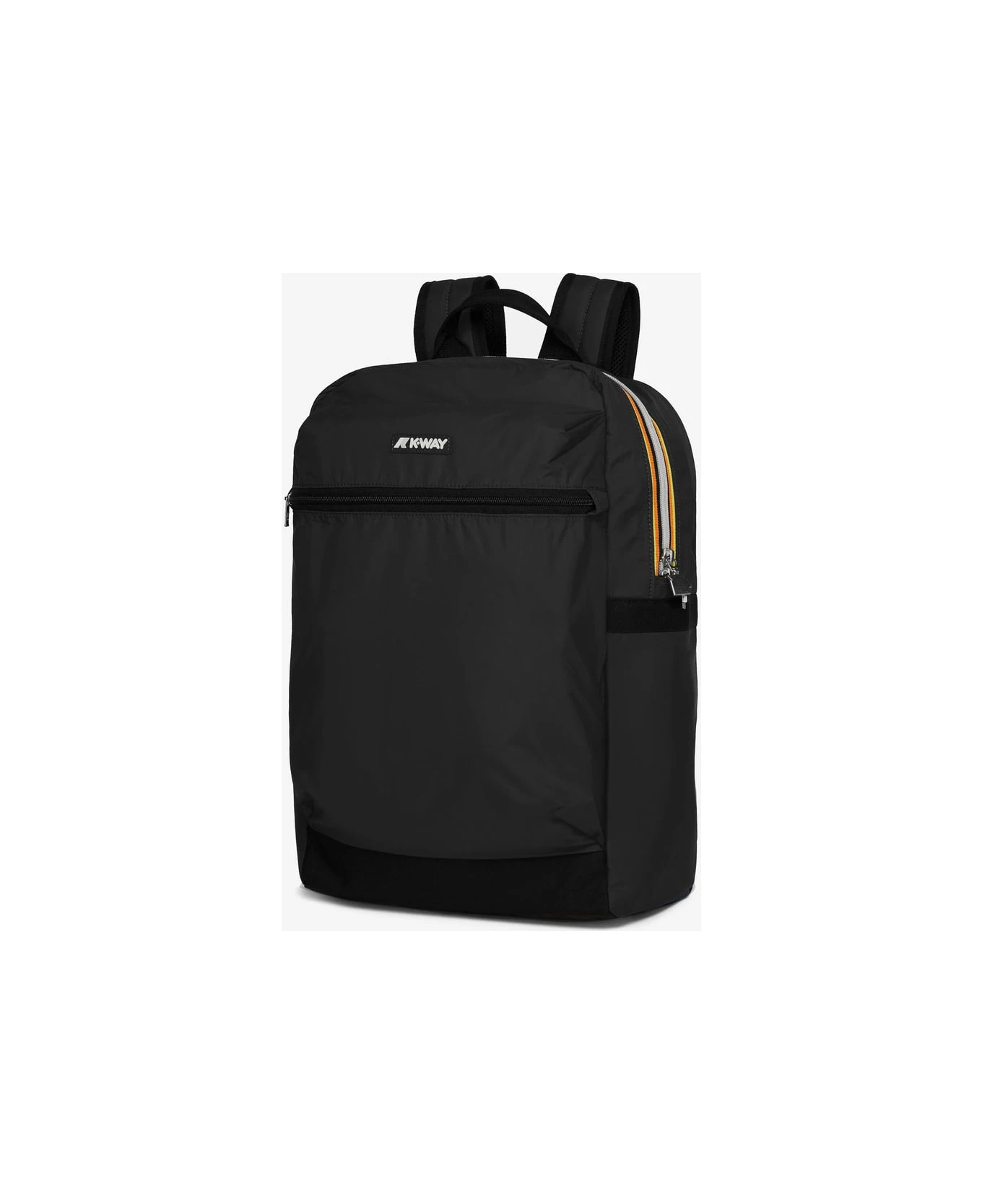 K-Way black nylon backpack, top zip closure, front zip, padded shoulder straps, front logo detail.