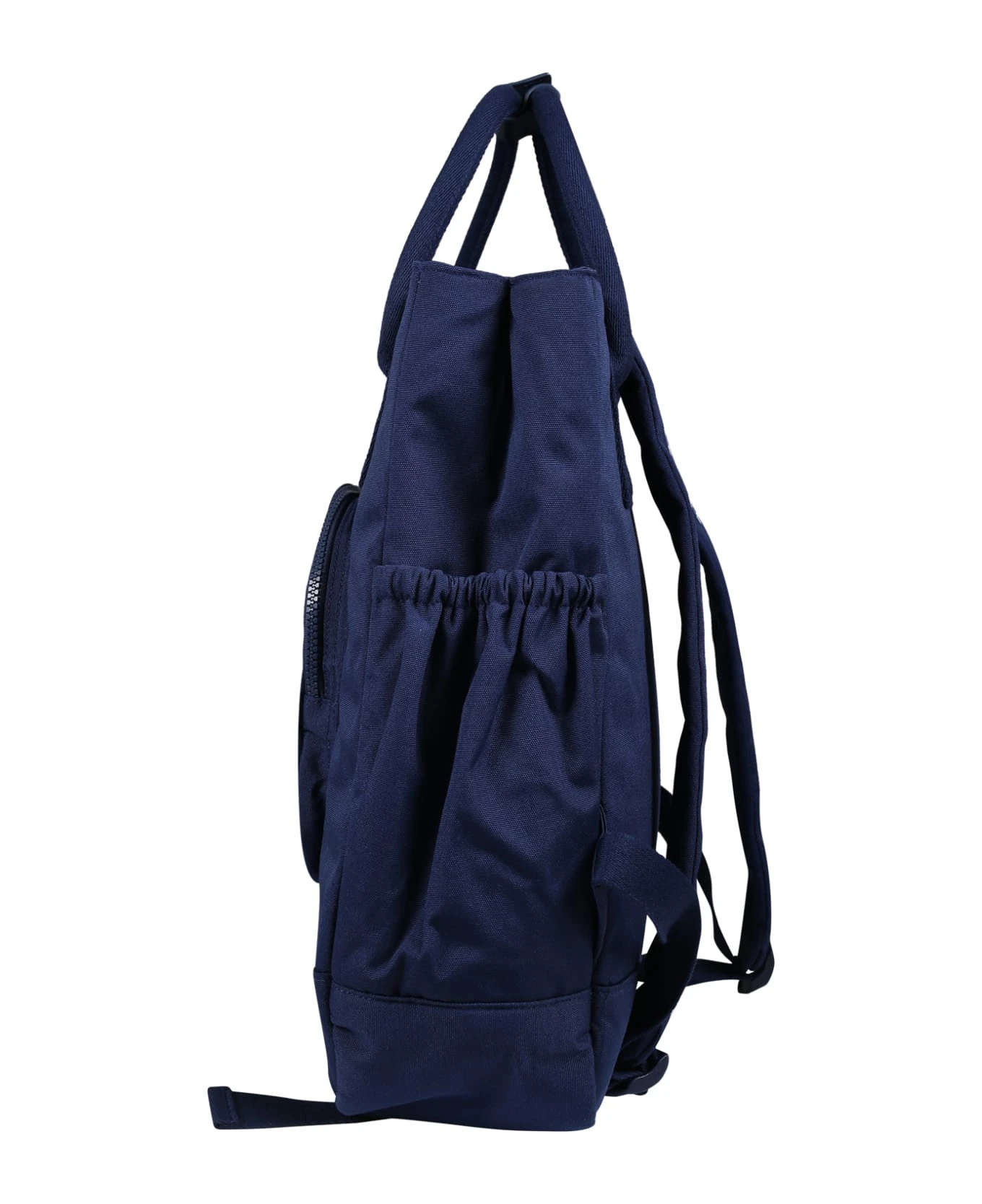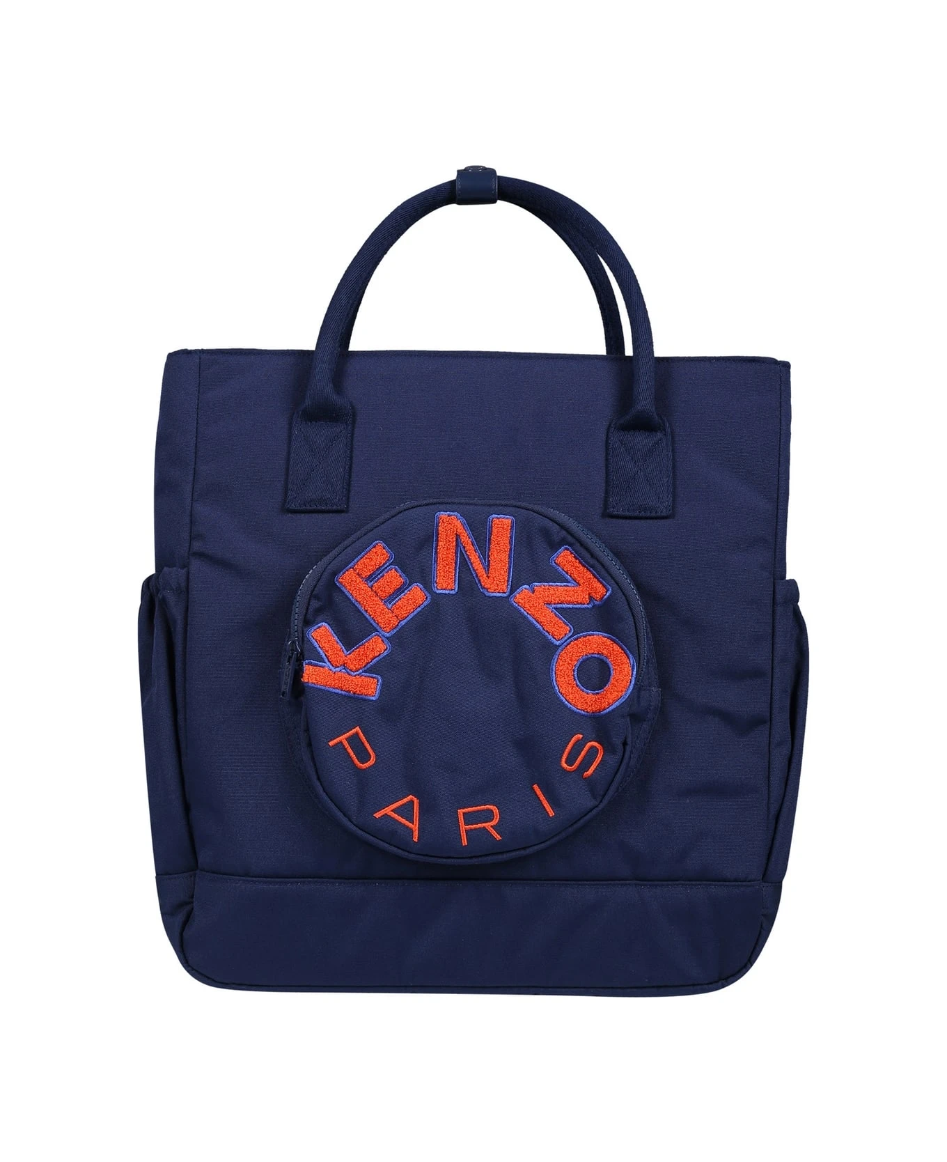 Blue changing bag, with handles, zip closure on the top, adjustable shoulder straps on the back, front zip pocket and side pockets; it is equipped with an internal changing table. It is embellished with embroidered logo on the front.