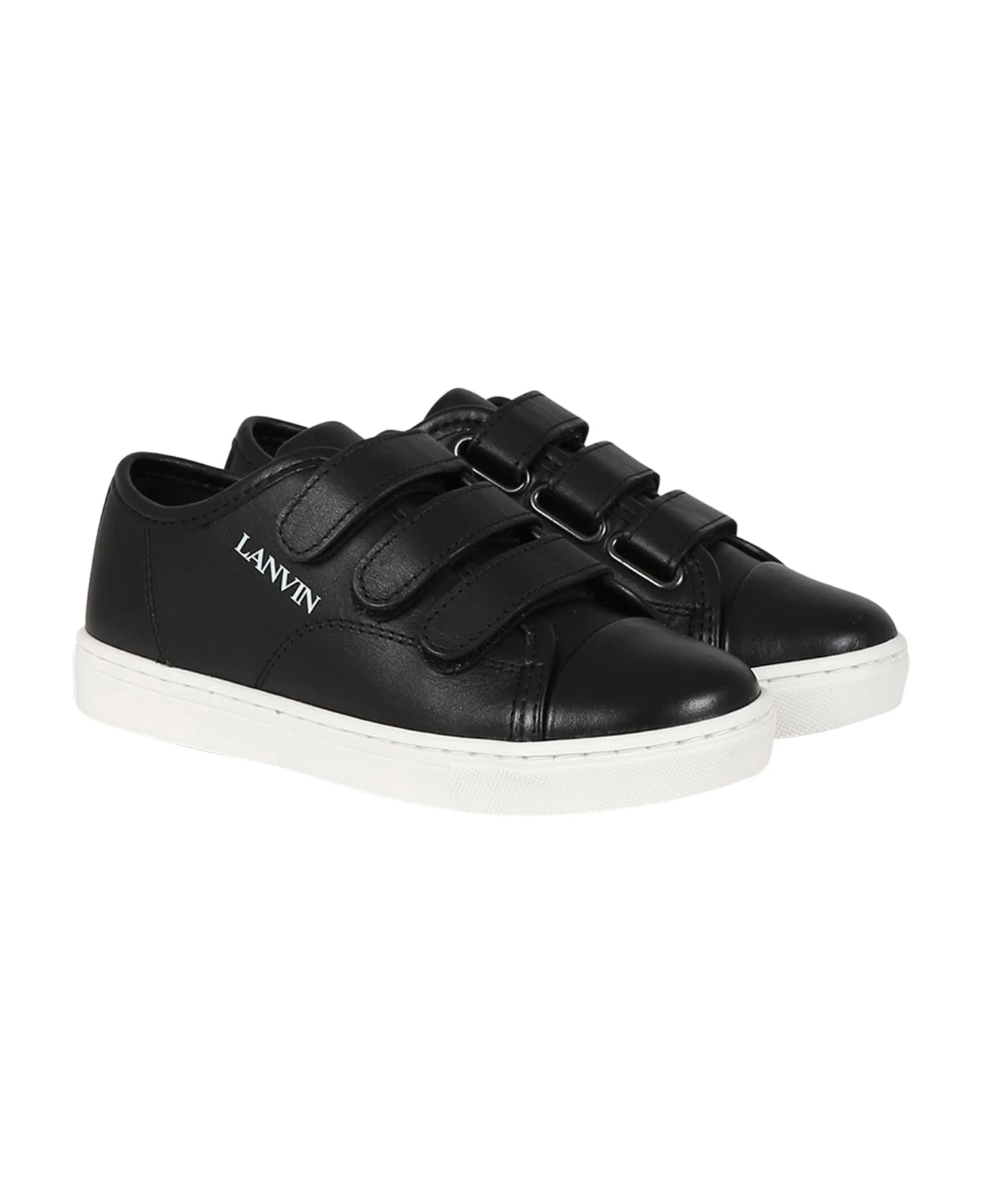 Black sneakers, in leather, with rubber sole, closure velcro tears on the top. They are embellished with white logo on the side.