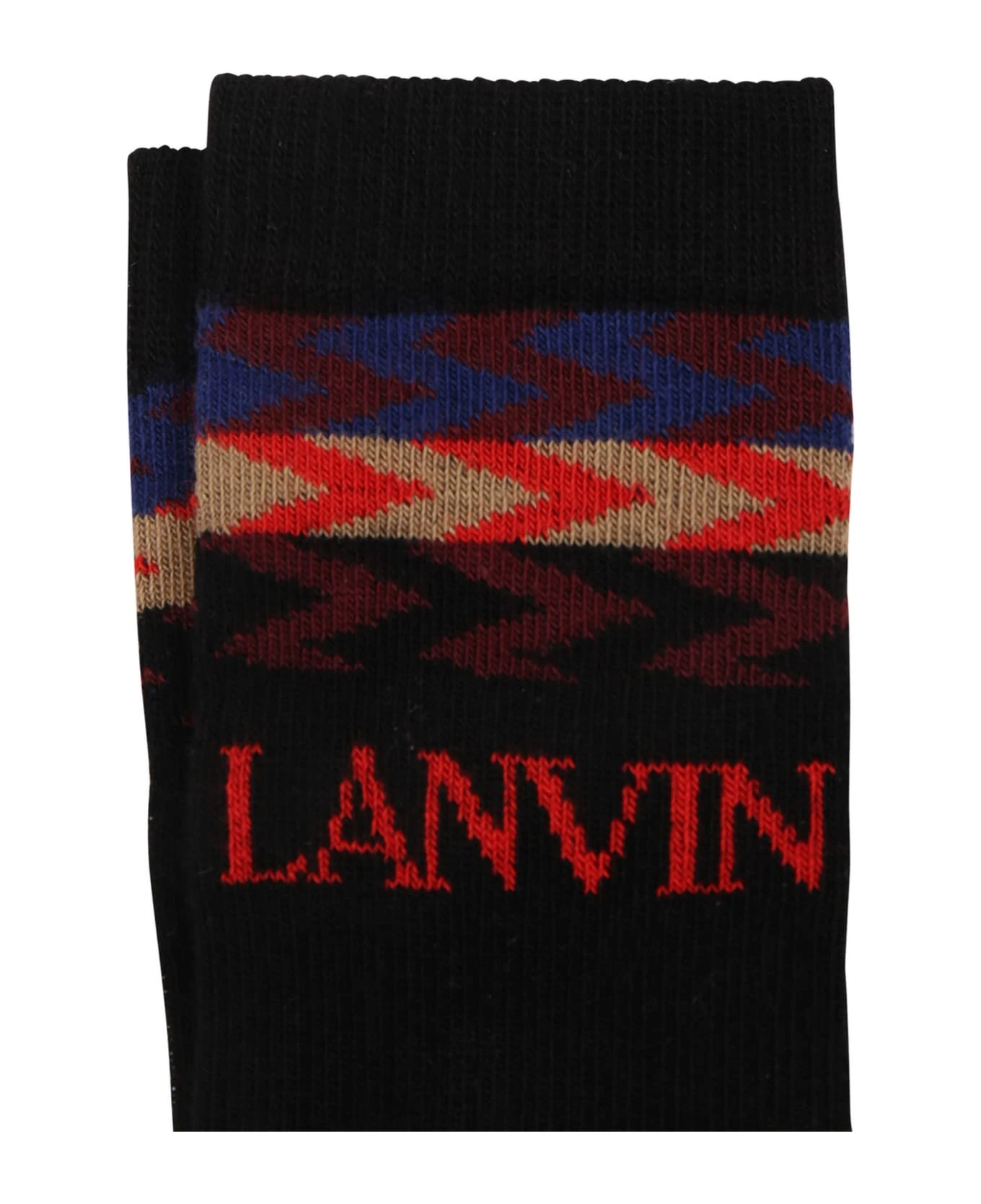 Black terry socks with ribbed hem. They are embellished with red logo and multicolor details on the top.