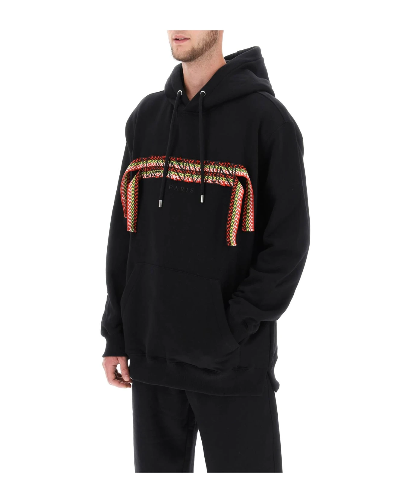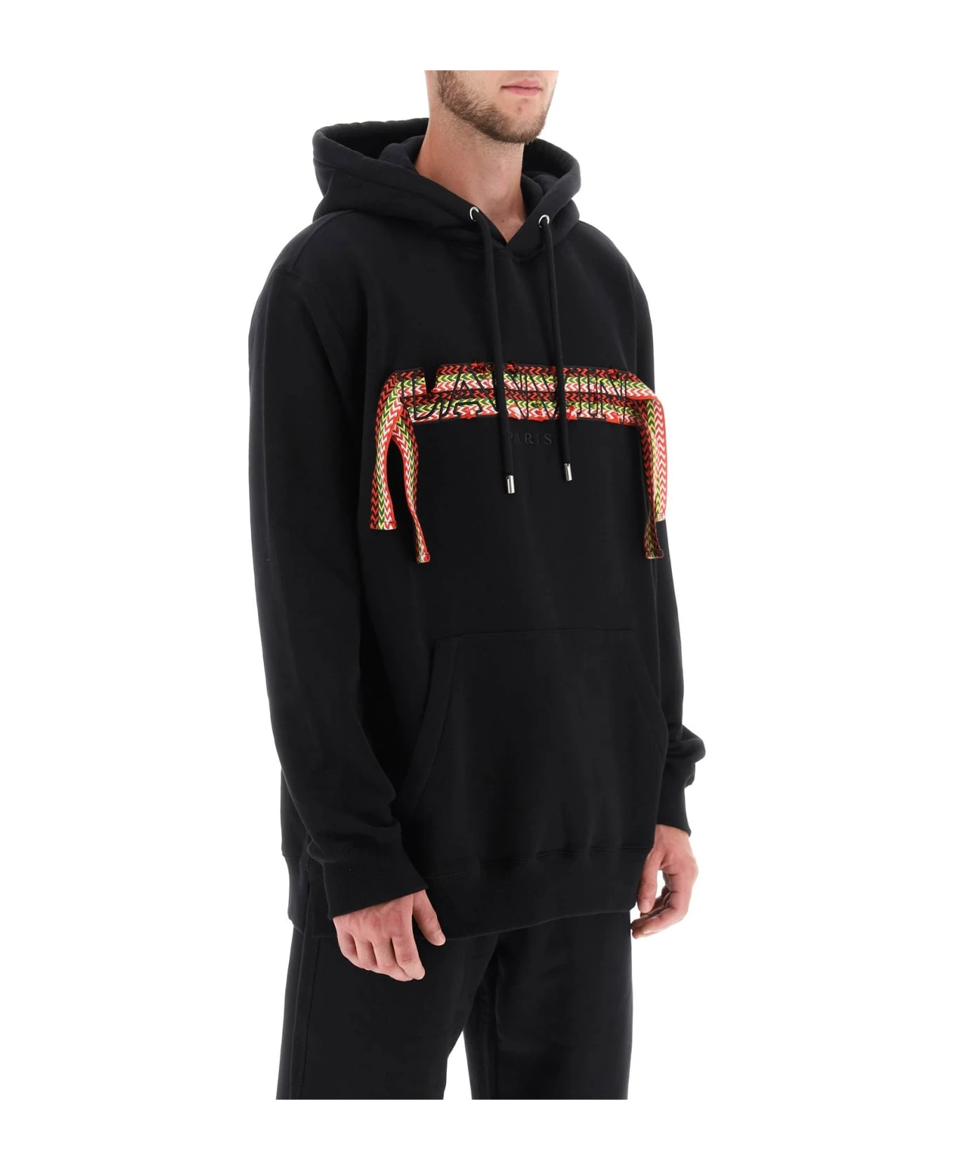 Lanvin oversized sweatshirt embellished with embroidered ‘Curb’ logo with long hanging laces. Made from fleece-back cotton jersey, it features drawstring hood, kangaroo pocket, and ribbed trims. The model is 187 cm tall and wears a size M.