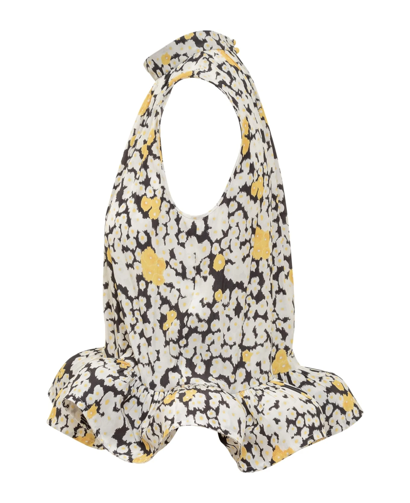Sleeveless round-neck top. Back button closure. Applied charmeuse ruffles. Small Daisy Bouquets all-over pattern.