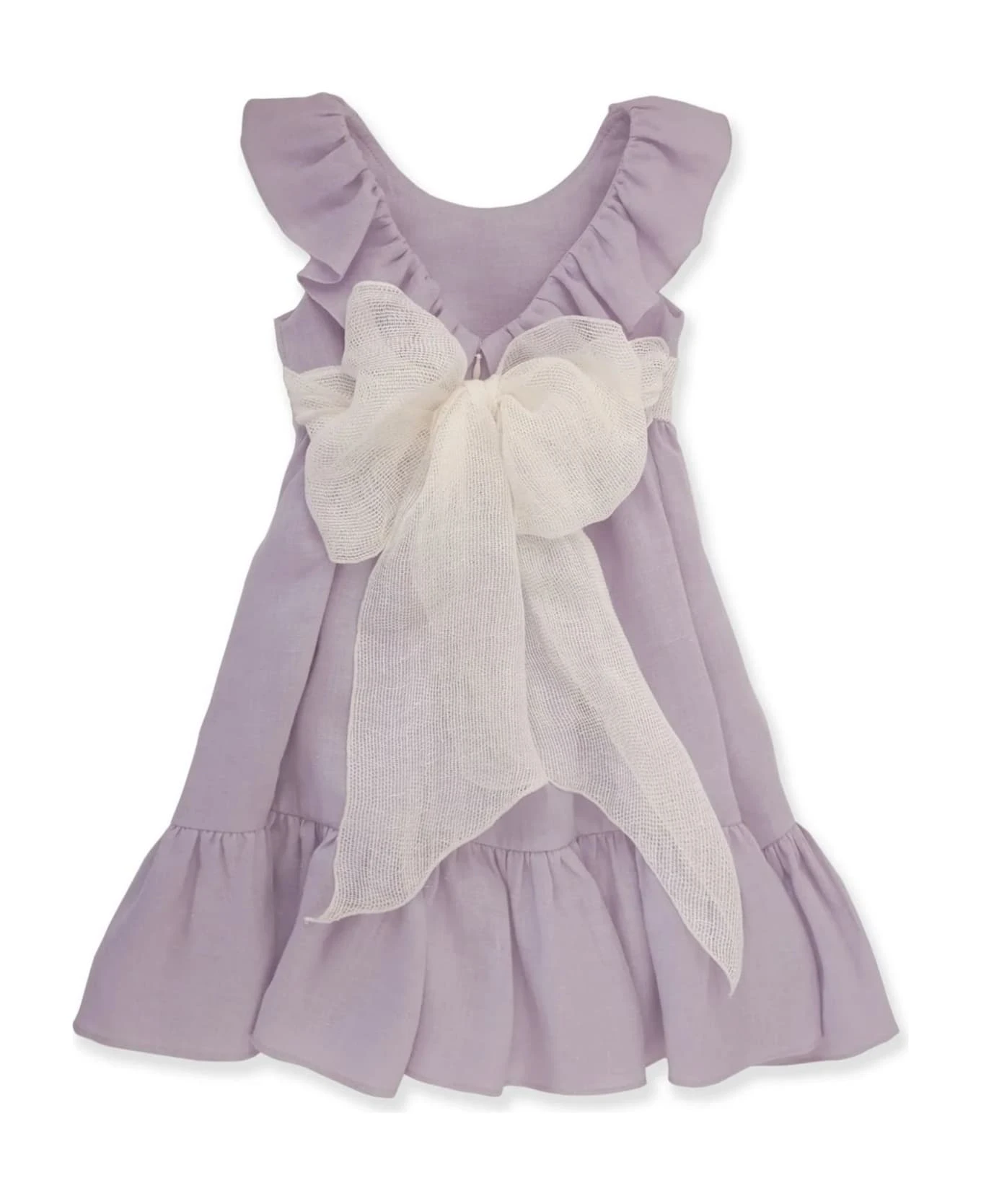 Light lilac linen unlined dress with white cotton sash, ruffle collar and back neckline
