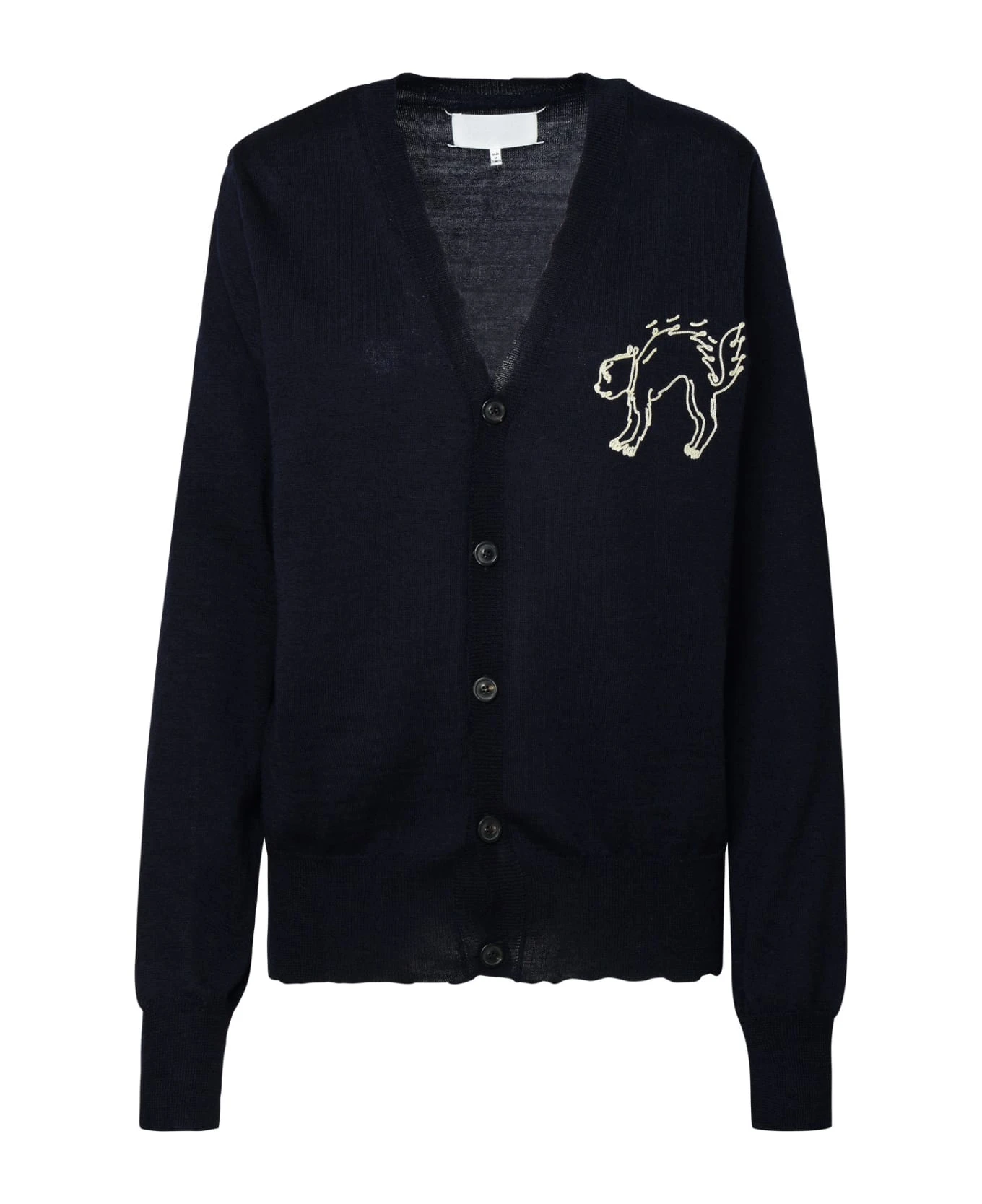 Ribbed V-neck, contrasting embroidery on the front, front button closure, iconic four seams symbol of the House on the back, ribbed cuffs and hem