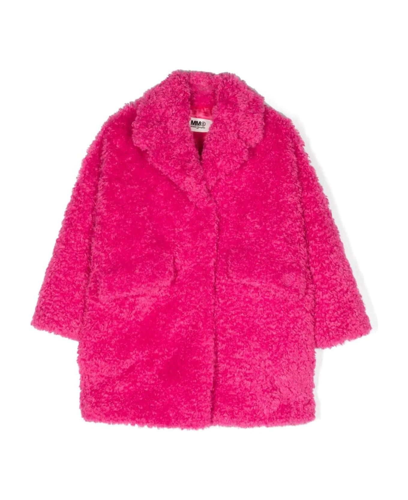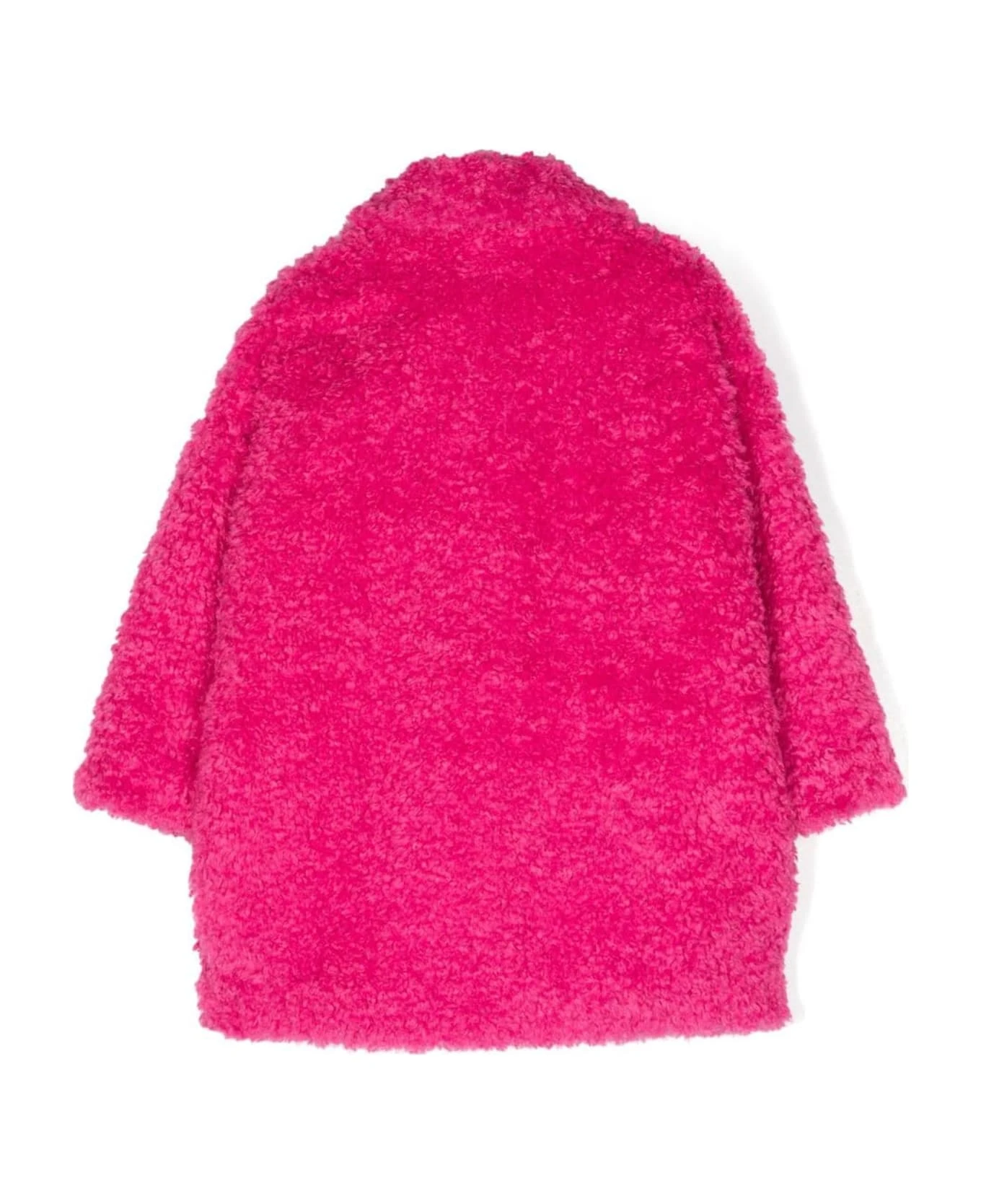 Fuchsia pink faux shearling coat, concealed front fastening, narrow notch lapels, long sleeves, two front welt pockets