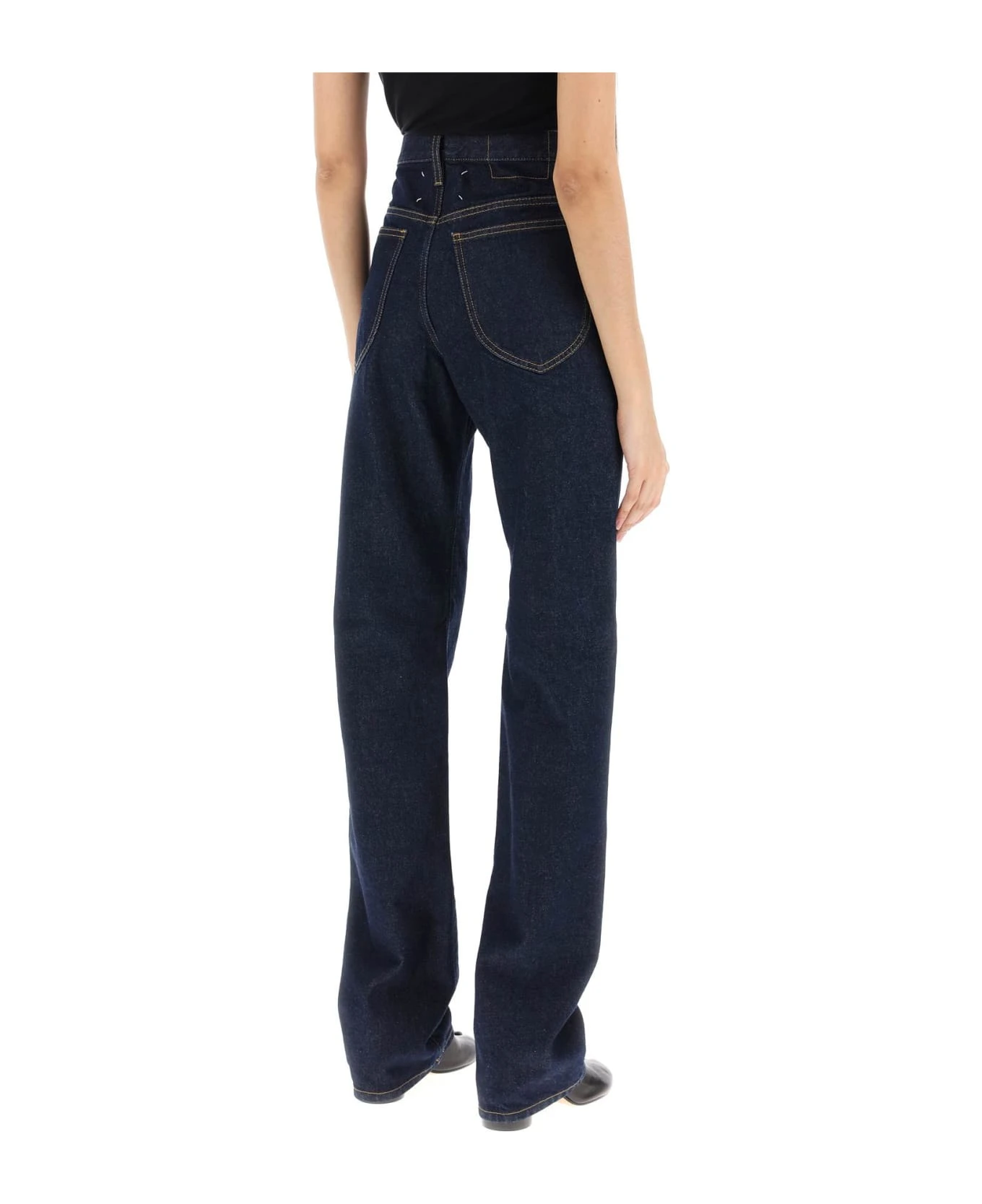 Maison Margiela jeans crafted in pure cotton denim with dark wash. Five-pocket design with belt loops and front fastening with zipper fly and button featuring a loose fit with straight leg and high-rise waist. The model is 177 cm tall and wears size 26.
