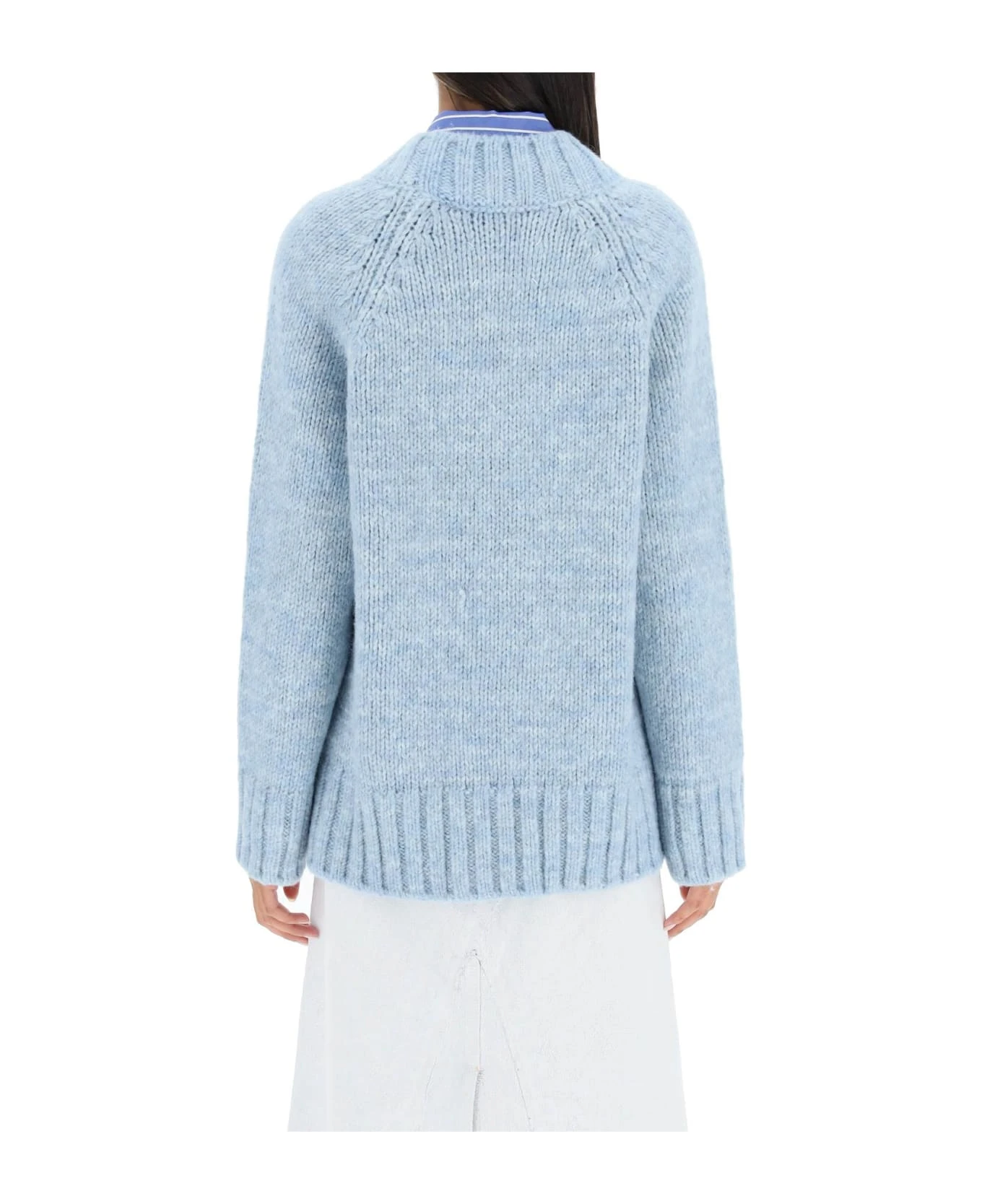 Oversized cardigan by Maison Margiela crafted in wool, alpaca and cotton melange yarn with a classic V-neck button front design. Raglan sleeves, wide-rib finishing. Signature four-stitches moniker on the back. The model is 177 cm tall and wears a size XS.