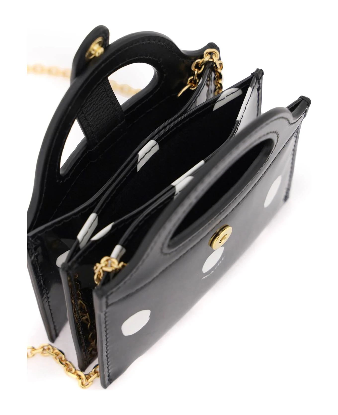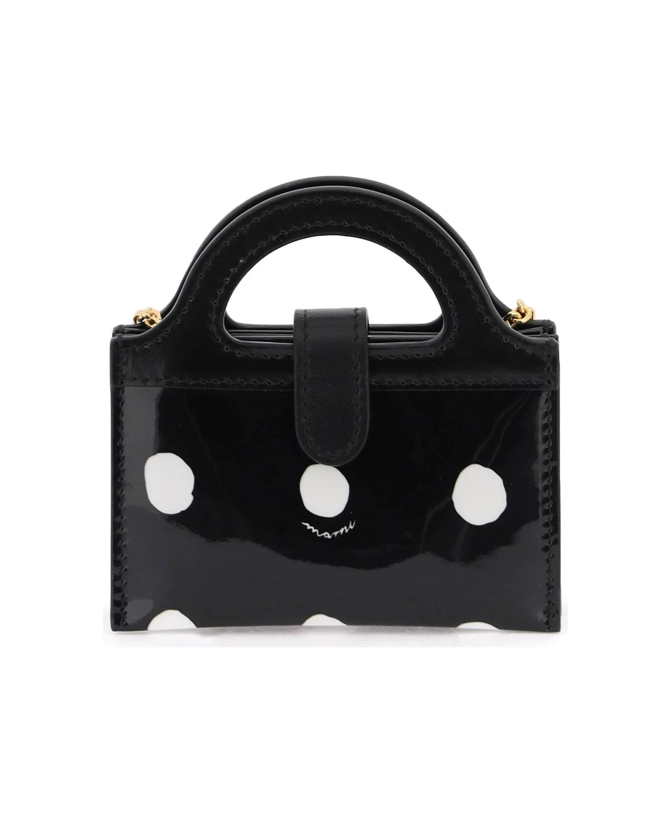 Patent leather bifold wallet by Marni with contrasting polka-dot print and tone-ontone smooth leather details. Snap-button closure, interior with a bill compartment, four credit card slots and a coin pocket. Gold metal chain with leather inset.