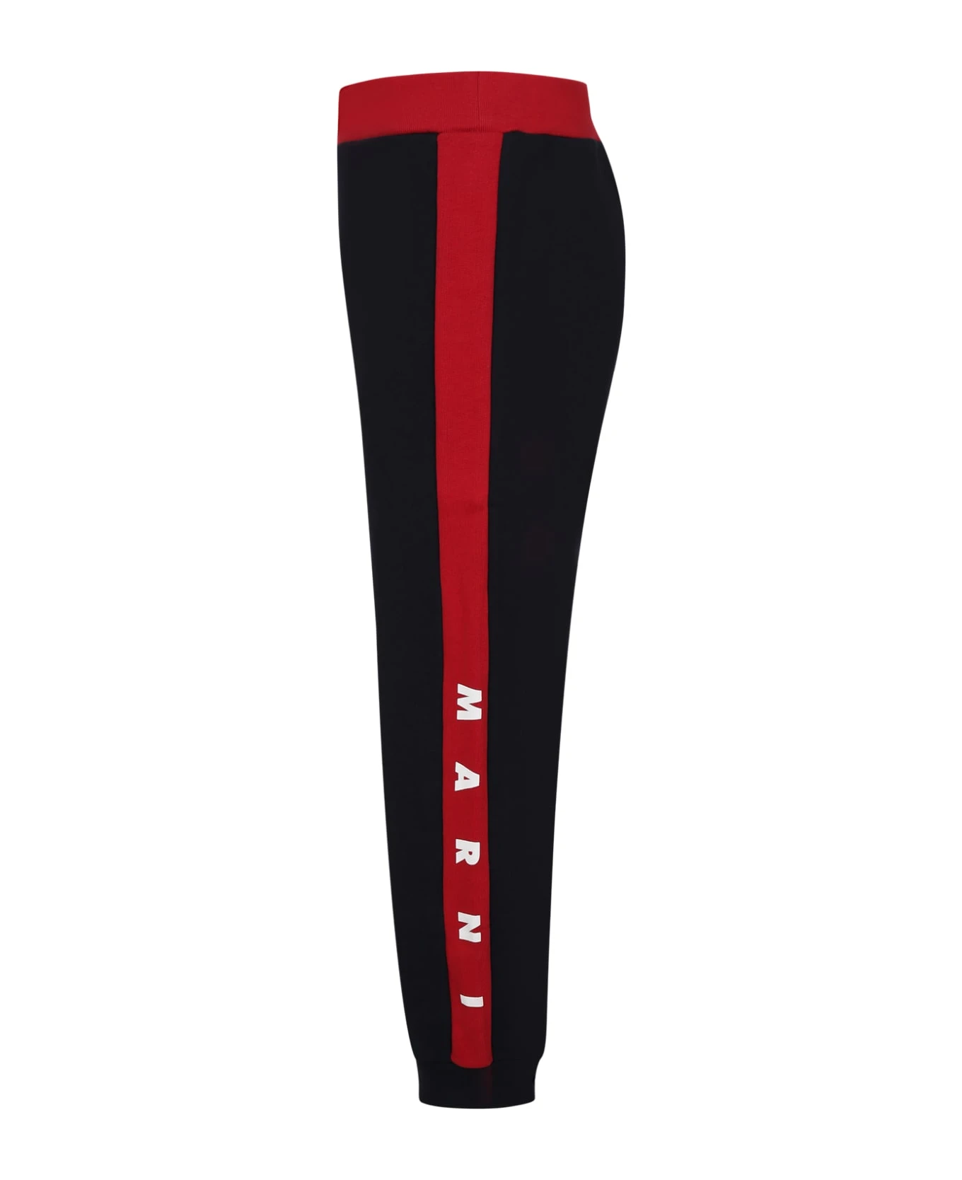 Blue tracksuit trousers in brushed cotton, red elastic waistband. It is embellished with red band on the side of both legs with white “Marni” brand logo print.