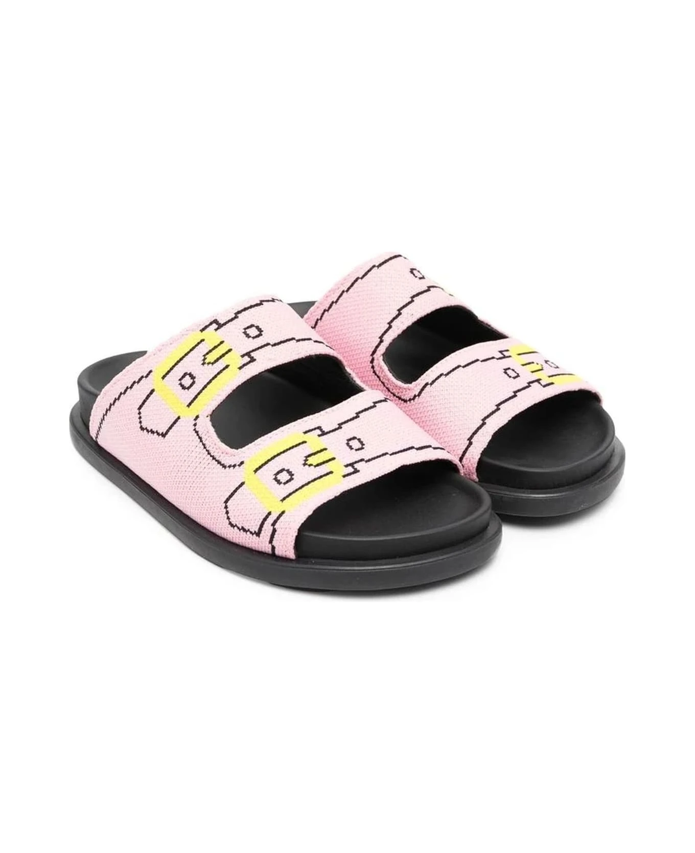 Light pink, calf leather, slip-on style, buckle print detail, open toe, branded insole and flat rubber sole.
