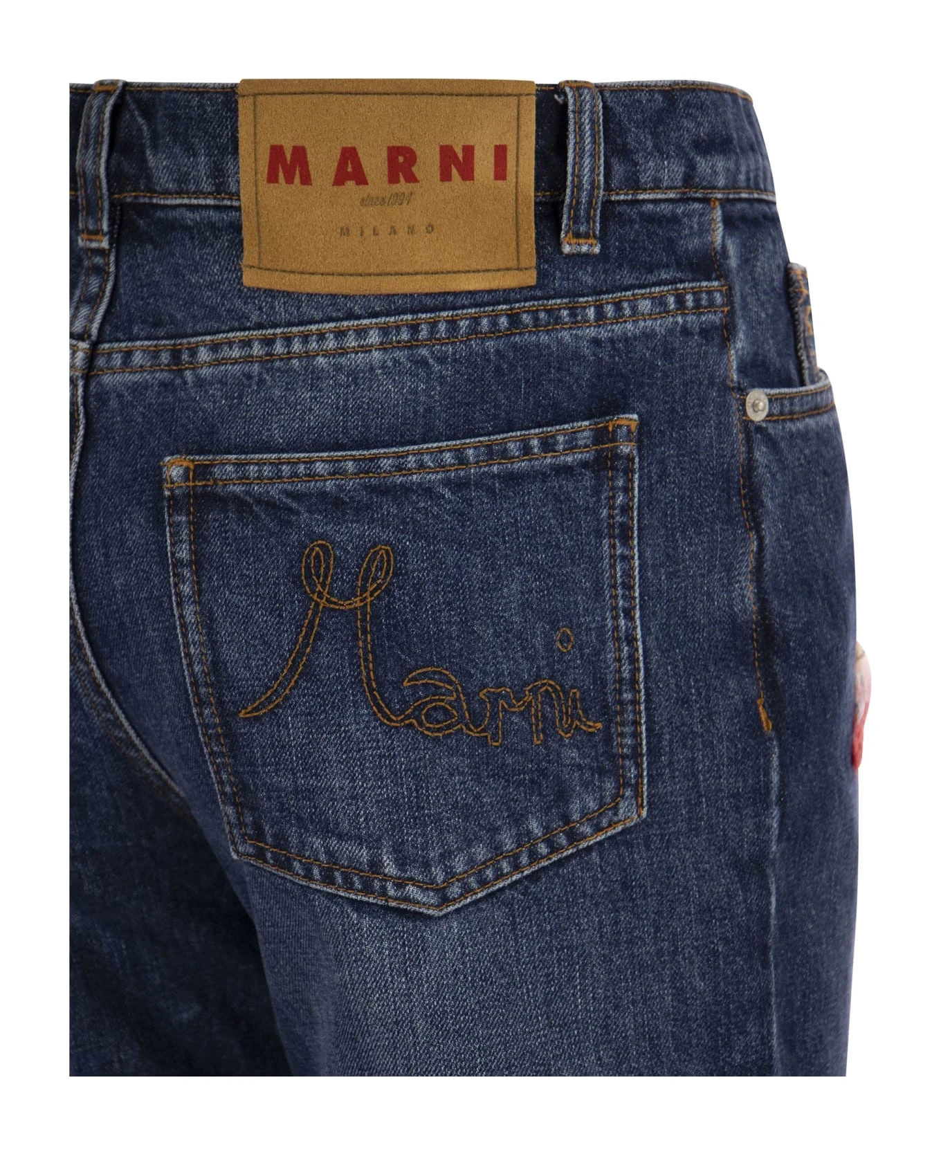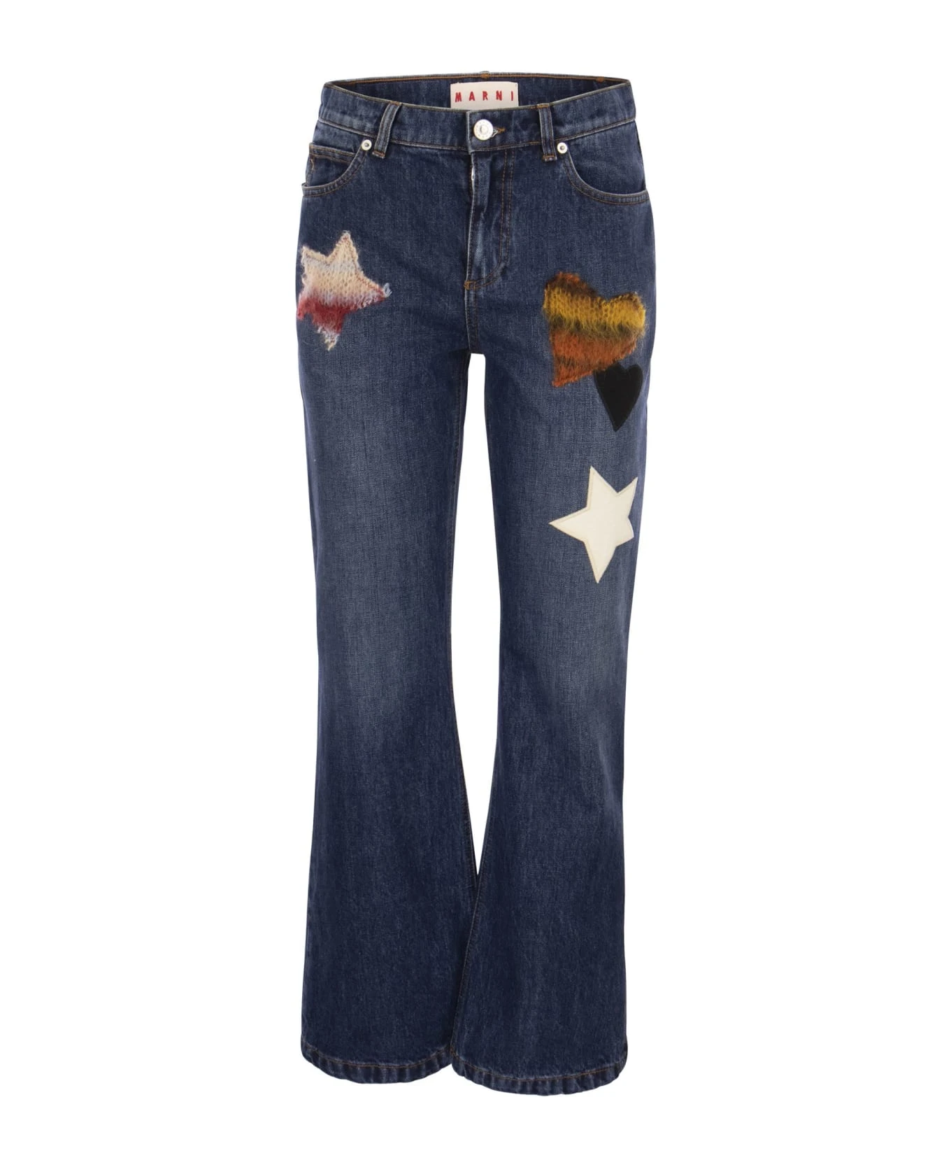 Medium-waisted 5-pocket trousers with regular line flared at the bottom. Featuring colourful applications in the shape of knitted stars and hearts. Leather logo label on the back. – Regular fit – Made in Italy – Knitted applications – Zip and button closure DESIGNER ID: PAJD0257M1 USCV42 STB80