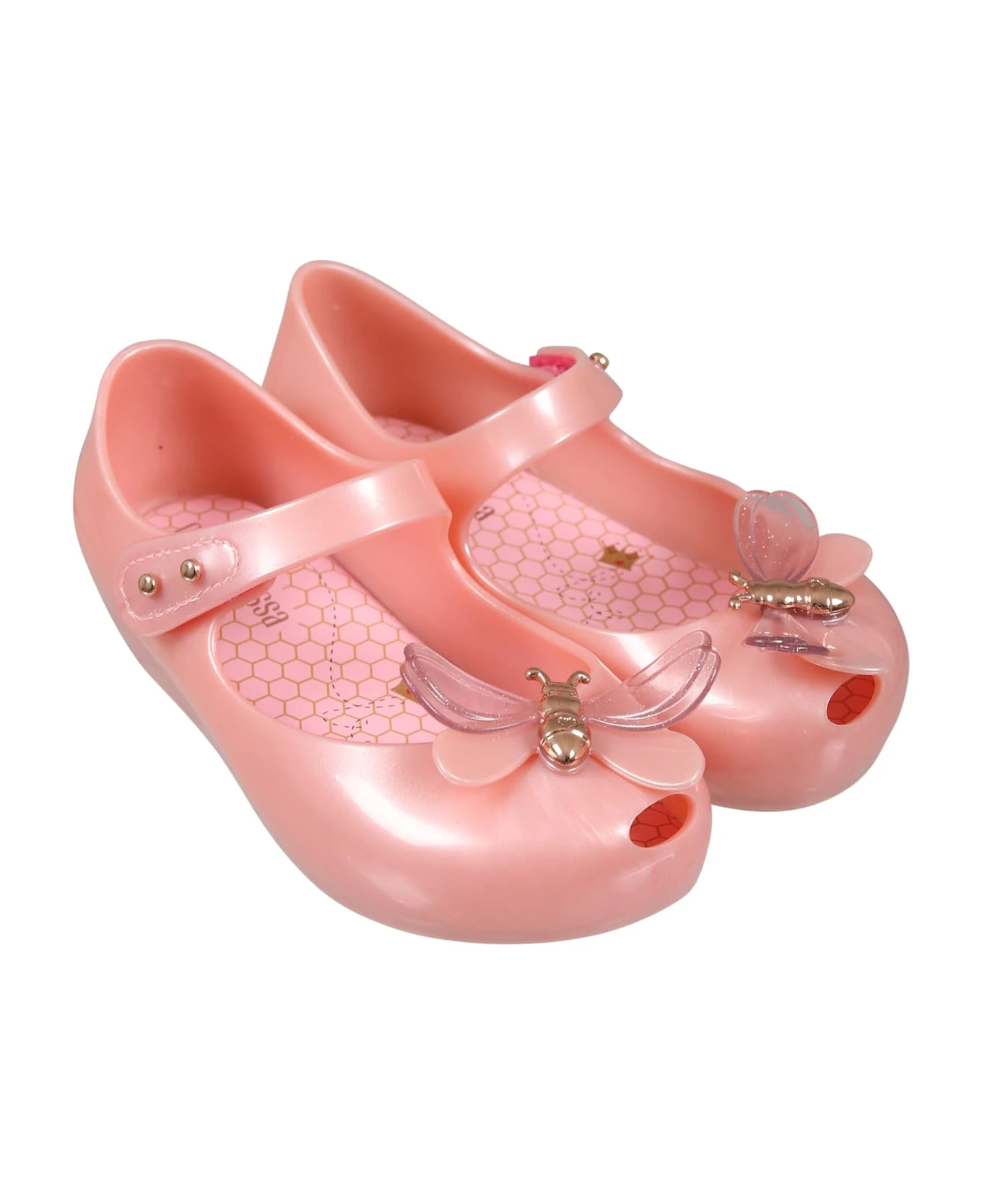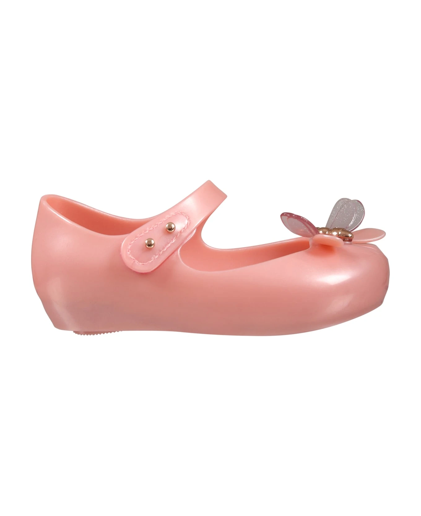 Pink scented ballet flats, with velcro closure, rubber sole and soft insole. They are embellished with butterfly applique on the front.